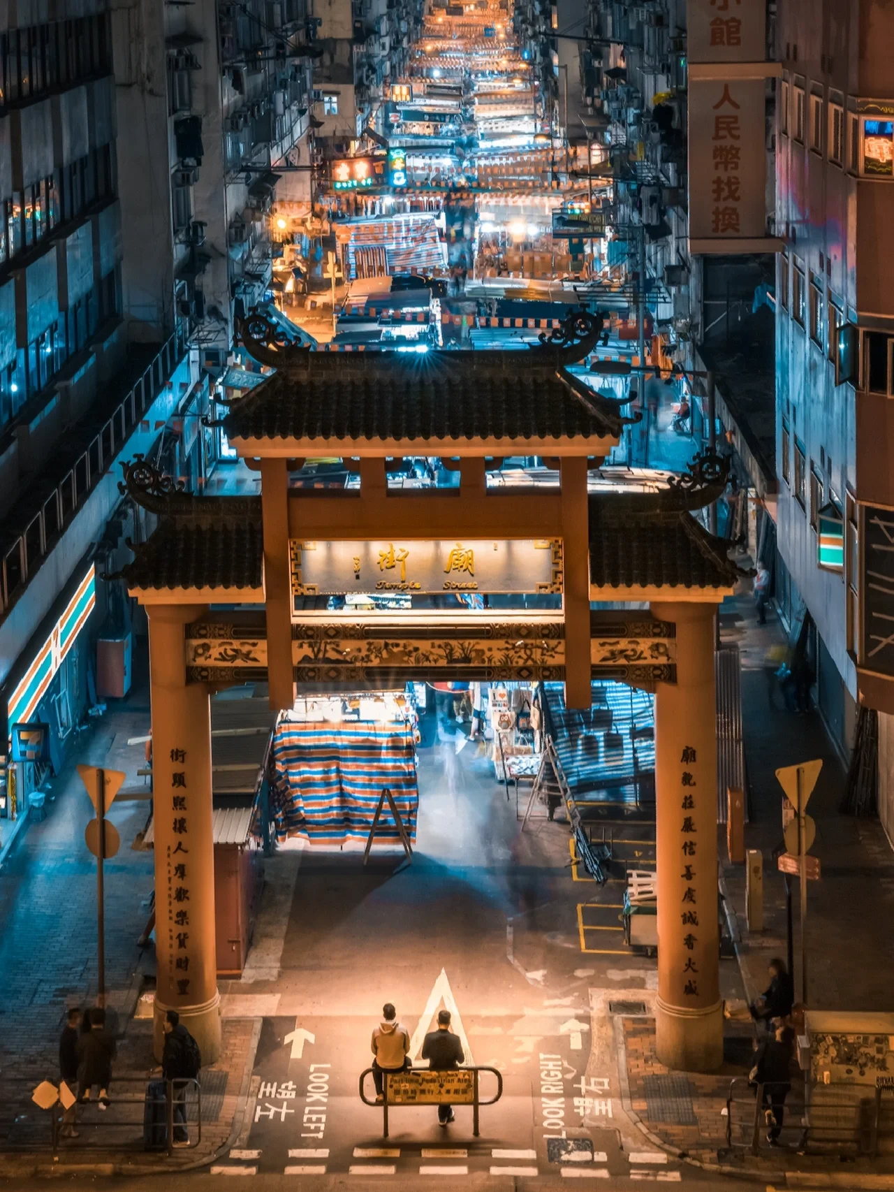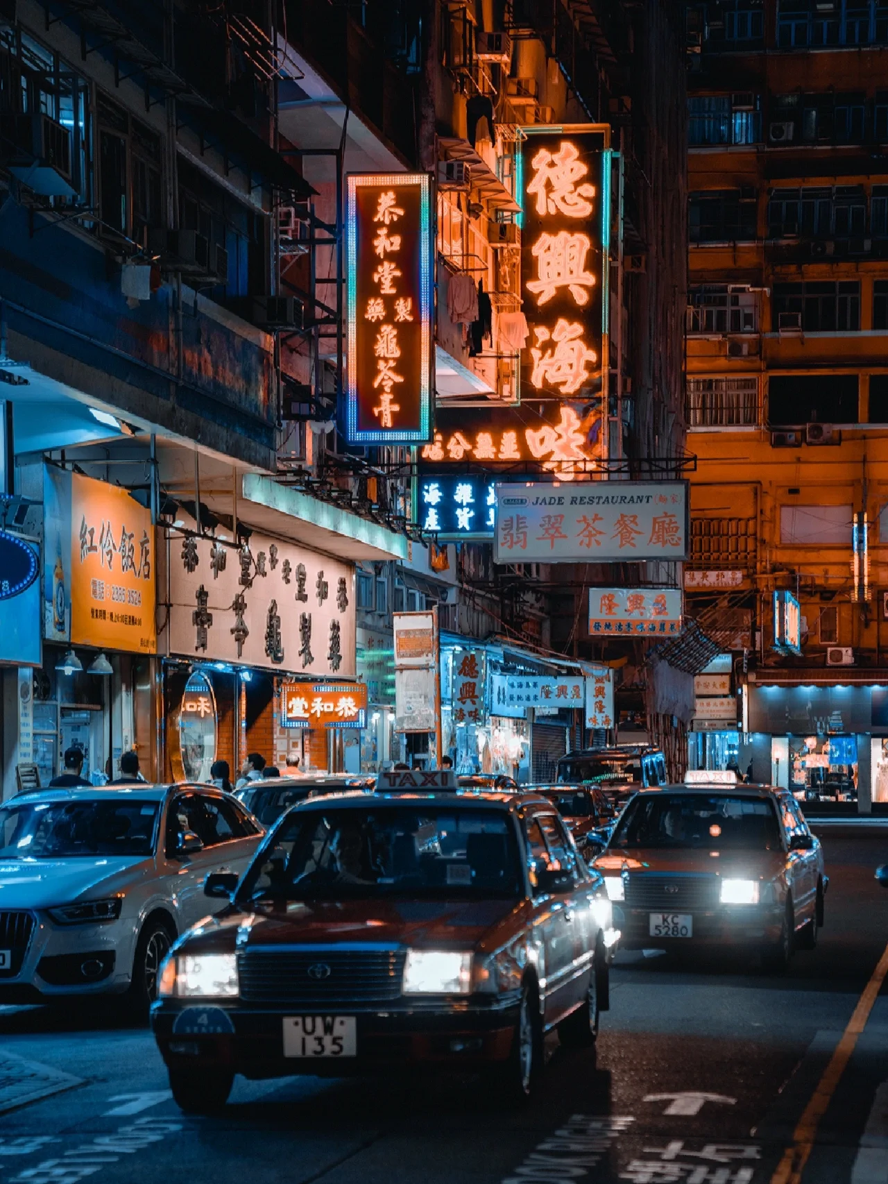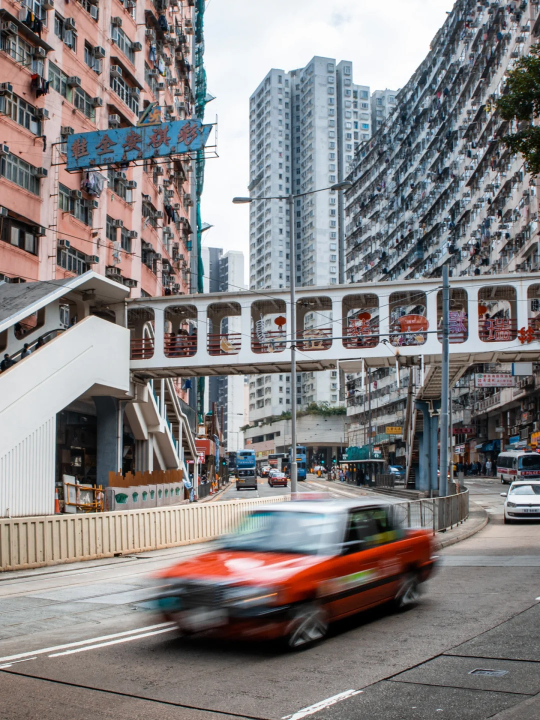 就在庙街牌坊的东边那一条街上、能拍到出租车和广告牌, 推荐使用中焦或者长焦镜头
