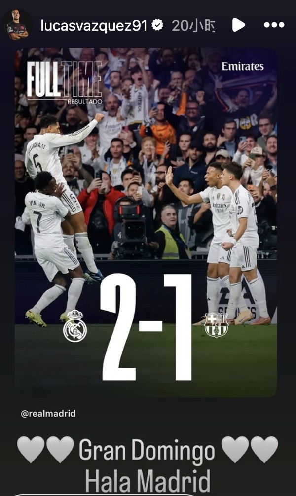 已经离开皇马的巴斯克斯更新社交媒体,庆祝老东家在国家德比中击败巴萨获得胜利。