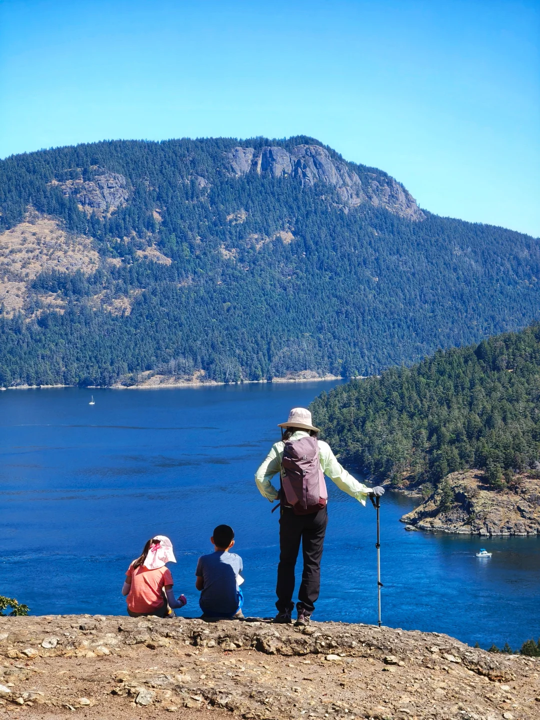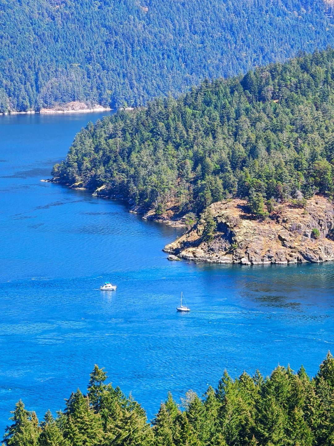 从Nanaimo回程Victoria,半路上随意找一小段trail走一走,无意中看到了stony hill,凭多年经验,感觉这里风景不差。果然一切如人所愿,当然也要拜今日好天气所赐 [合十R] 登上山顶,俯瞰峡湾,阳光照射下,大海呈现出深浅不同的蓝色,愈现迷人。。。