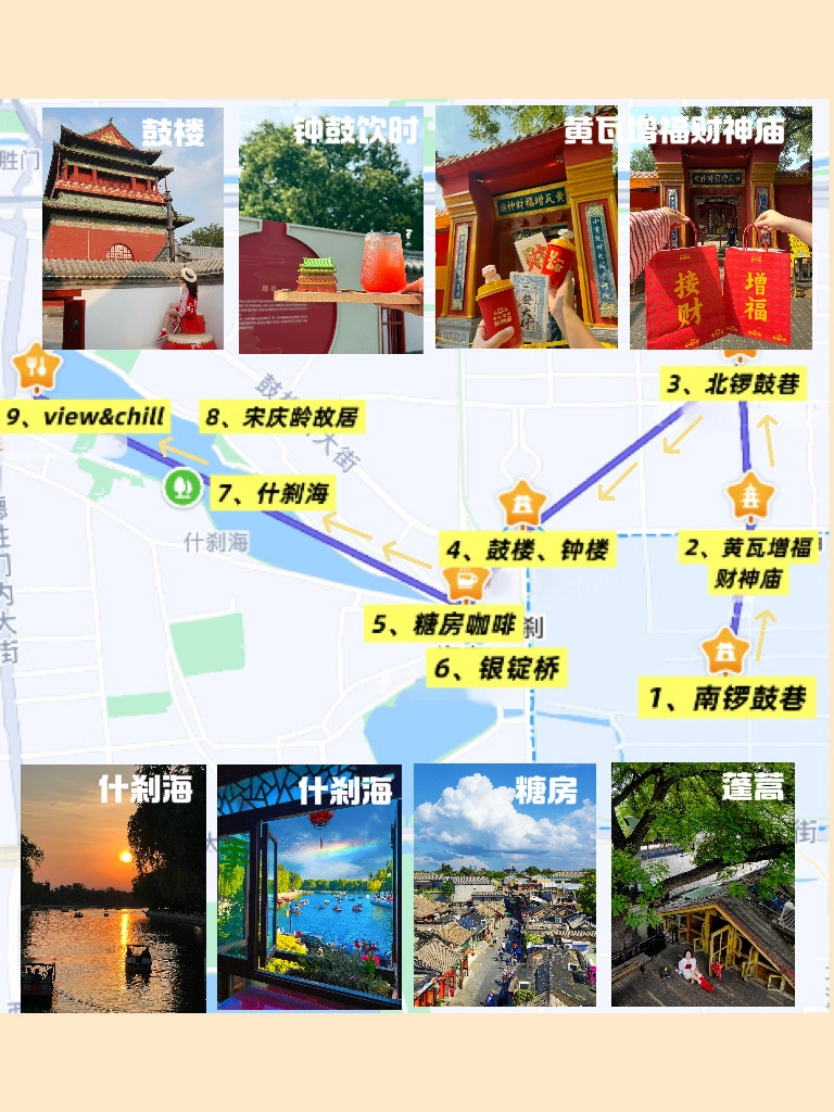南锣鼓巷→黄瓦增福财神庙→北锣鼓巷→钟楼/鼓楼→烟袋斜街→什刹海→银锭桥→宋庆龄故居→后海日落🌅