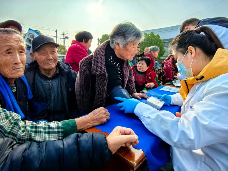 饺子宴开席前,村委会广场早已成了综合服务大集。义诊台前,志愿者正在给老人们量血压、测血糖、评估健康指标。一位留守老人说:“在家门口就有人给俺检查身体,真是好!”一旁的义剪区,“阜南好人”理发师徐理想两个小时没直腰,“这些老人的子女大多不在身边,陪老人过节、给老人理发,我感觉特别有意义也很开心!”