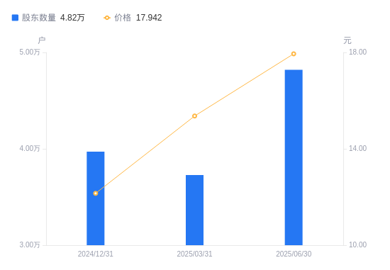 日期A股户数(户)流通A股户均持股数(股)户均持股市值(万元)2025-09-305819712196.5347.202025-06-304820214725.5626.422025-03-313728719036.1629.242024-12-313971513148.5515.982024-09-303110216790.2523.732024-06-303163516507.3620.592024-03-313476415021.7017.762023-12-313538714757.2417.582023-09-303469915043.6819.802023-06-303663114250.2417.53