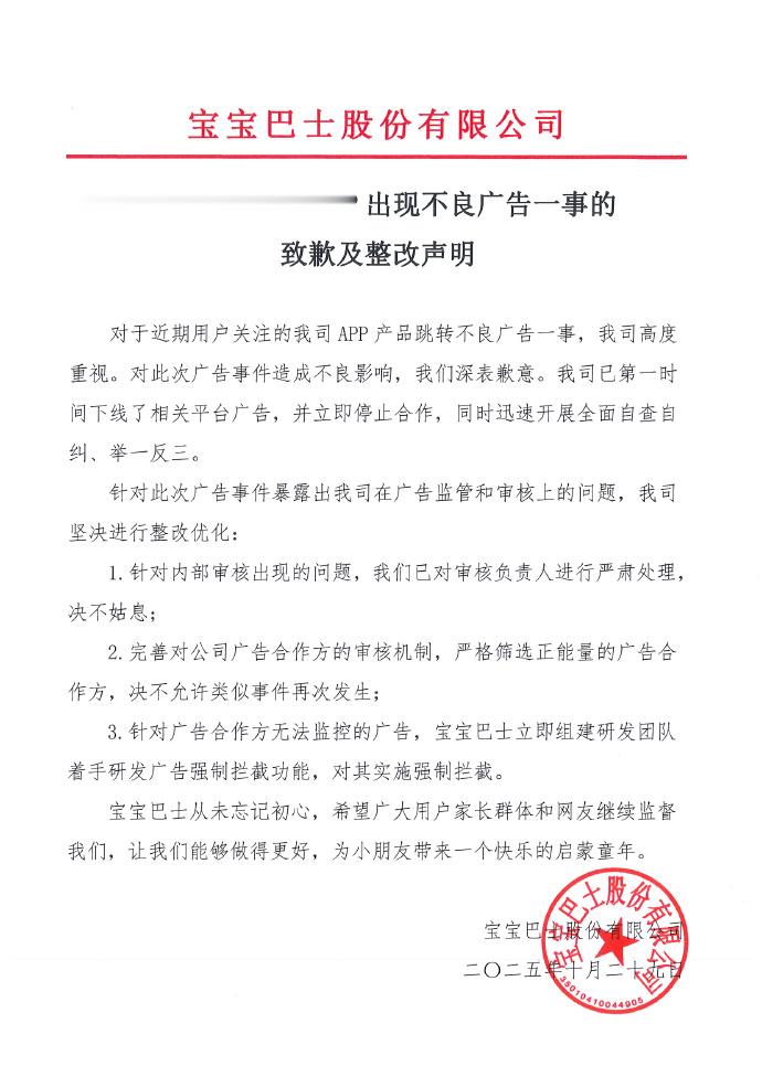 10月29日午间,宝宝巴士发布《关于宝宝巴士APP出现不良广告一事的致歉及整改声明》。声明称,宝宝巴士已第一时间下线了相关平台广告,并立即停止合作,同时迅速开展全面自查自纠、举一反三。