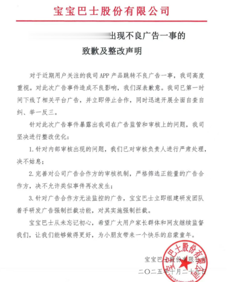 今日午间,针对宝宝巴士App产品跳转不良广告一事,宝宝巴士官微发布致歉整改声明。