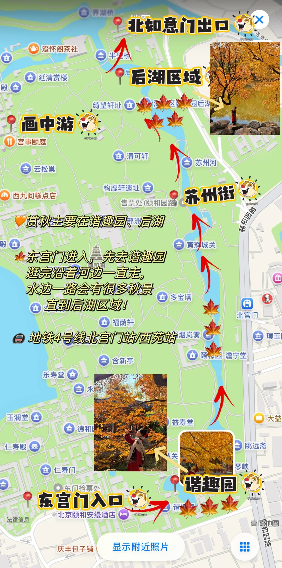 东宫门进入➠谐趣园➠沿湖一直走➠ 途径苏州街(在修缮)➠后湖🍂➠北宫门出