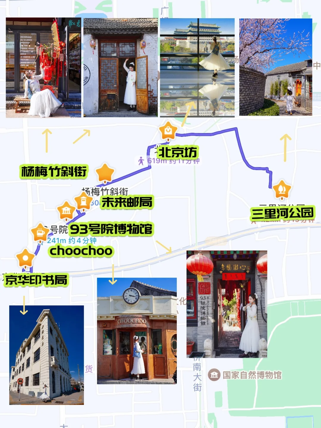 京华印书局📚→93号院博物馆→未来邮局🏣→杨梅竹斜街→前门大街→北京坊→Pageone书店→三里河公园🦢