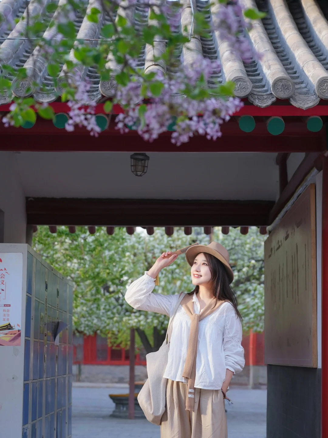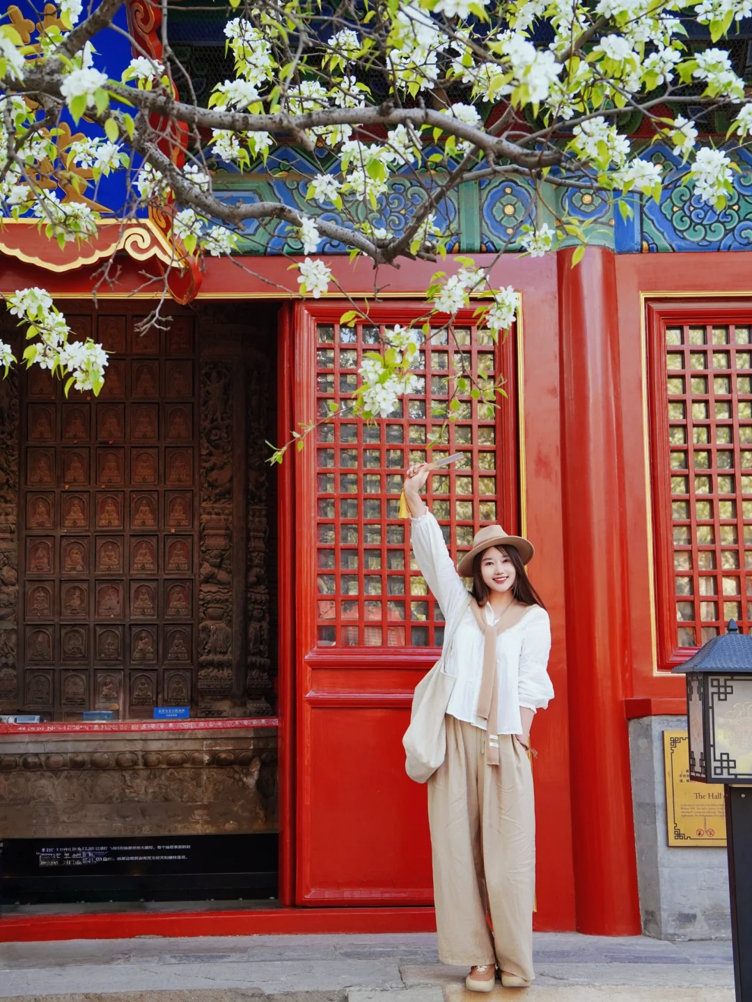 ❹ 站在智化殿两侧的红色门窗,头顶是梨花,这人少