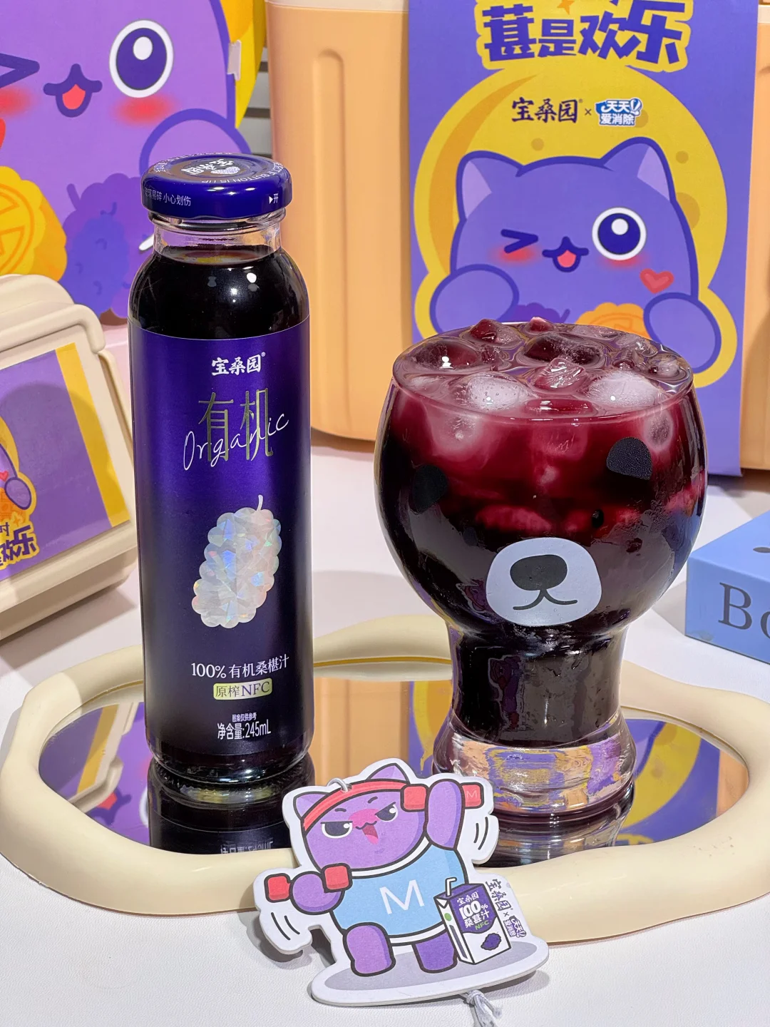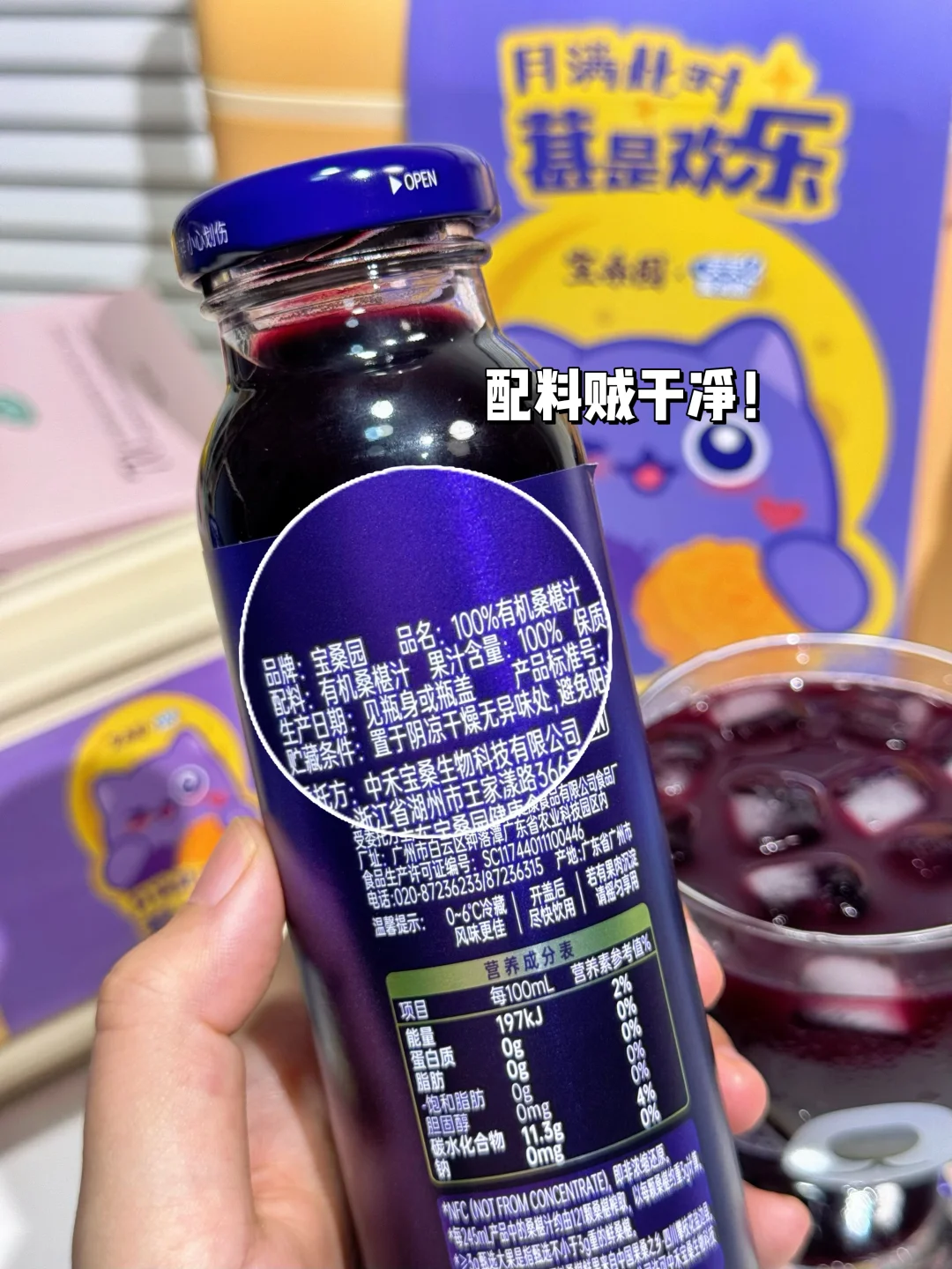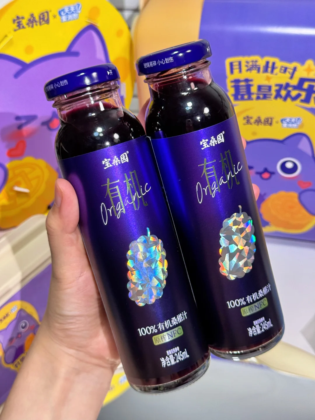 而且新品100%有机桑葚汁也贼顶!!不愧是广东农科院研发的,配料表干净到只有桑葚汁,0添加蔗糖和水,喝着安全感直接拉满。一口下去全是果子本身的酸甜,浓郁果香在嘴里炸开,像在嚼新鲜桑葚一样。