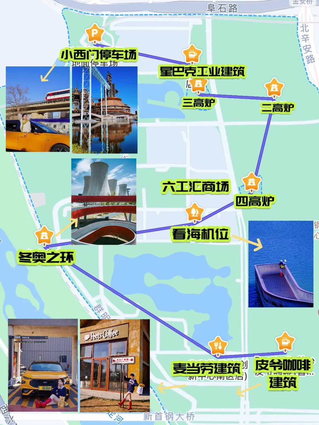 西门停车场→秀池→星巴克建筑☕️→三高炉→二高炉→四高炉→六工汇🍻→群明湖观景台→冬奥之环→🍟麦麦薯条大道→皮爷咖啡建筑🏗️→新首钢大桥