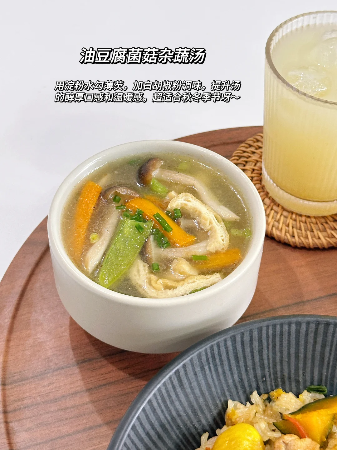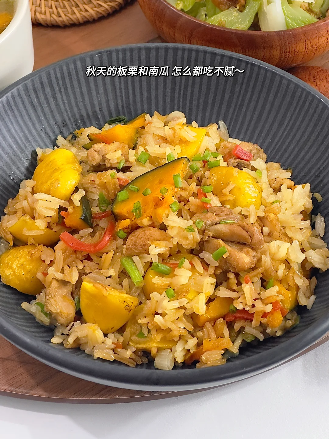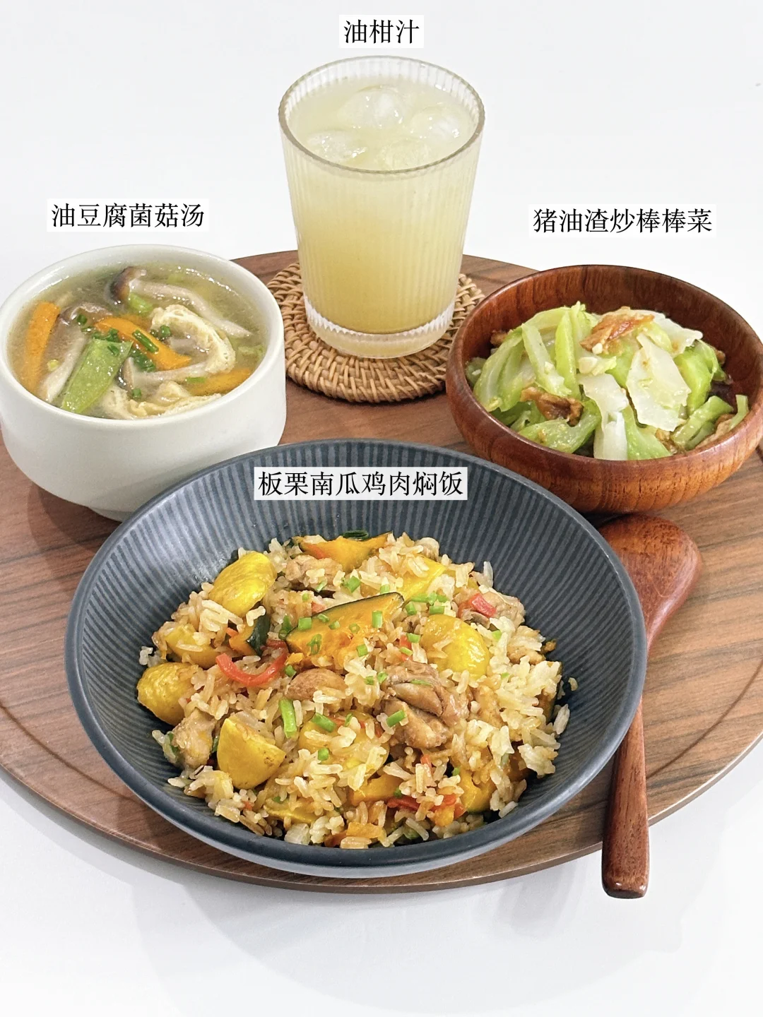 今日餐食分享: ▪️板栗南瓜鸡肉焖饭 ▪️油豆腐菌菇汤 ▪️猪油渣炒棒棒菜 ▪️油柑汁 秋天的板栗和南瓜 高饱和度的色彩 甜蜜粉糯的口感 拿来焖饭好吃好看好营养~ 棒棒菜开始上市啦 用猪油渣简单清炒都好好吃!