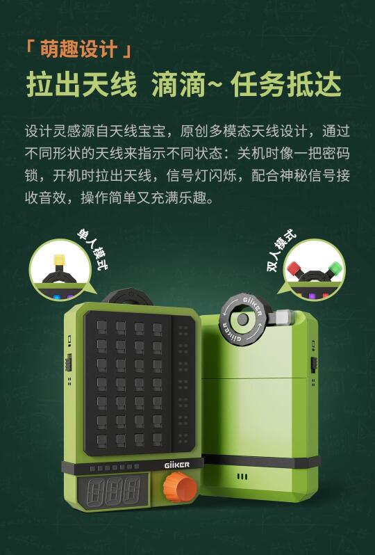 设计灵感源自天线宝宝,原创多模态天线设计,通过不同形状的天线来指示不同状态:关机时像一把密码锁,开机时拉出天线,信号灯闪烁,配合神秘信号接收音效,操作简单又充满乐趣。