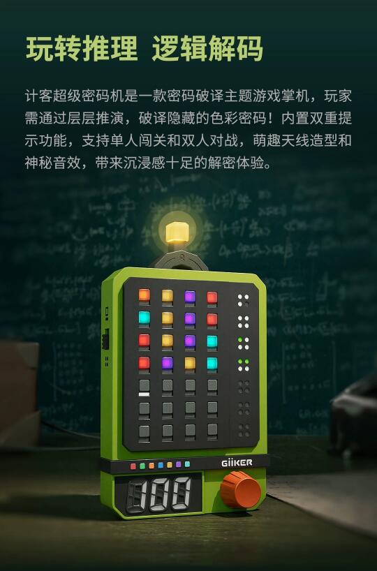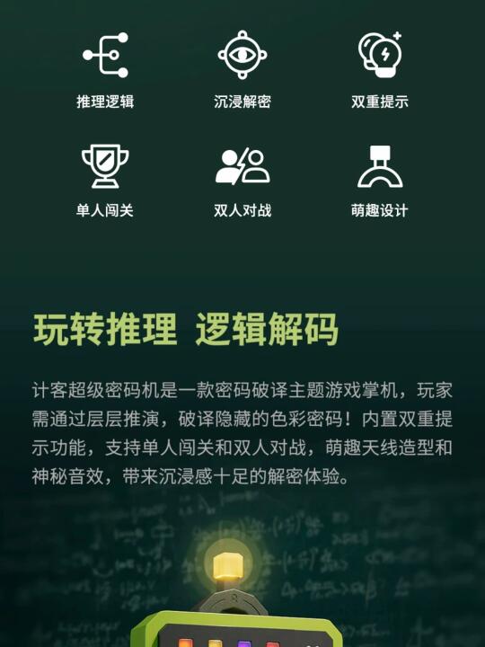 计客超级密码机是一款密码破译主题游戏掌机,玩家需通过层层推演,破译隐藏的色彩密码!内置双重提示功能,支持单人闯关和双人对战,萌趣天线