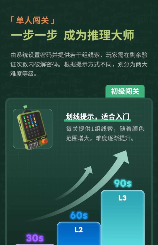 中玄统设罟宓码并提供共干组线去 玩家重在剩余验证次数内破解密码。根据提示方式不同,划分为两大难度等级。