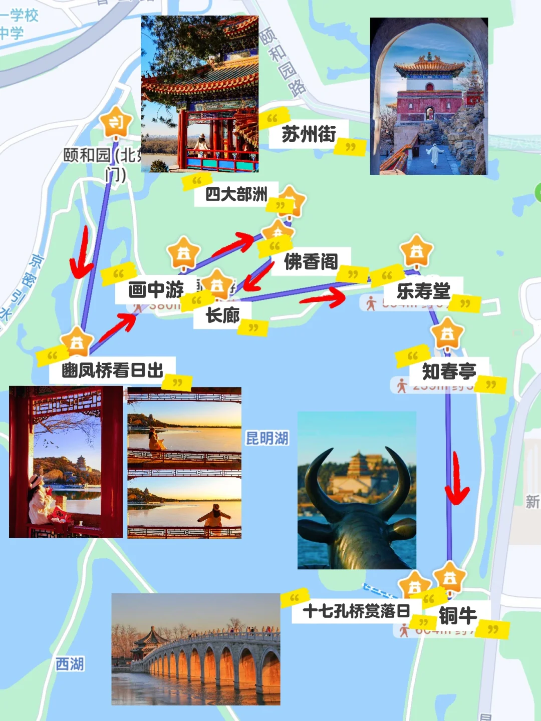 北如意门进➠豳风桥➠画中游➠四大部洲➠佛香阁➠长廊➠乐寿堂➠仁寿殿➠知春庭➠铜牛➠十七孔桥🔚