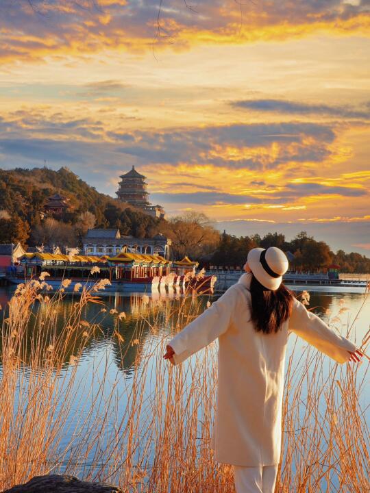 以亭框取景拍摄,像一幅画!桥旁湖边可以和长椅、芦苇荡同框,远处是佛香阁日出大概在7:30,拍摄可在7:30-8:00之间