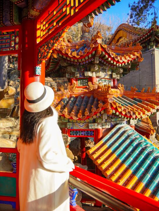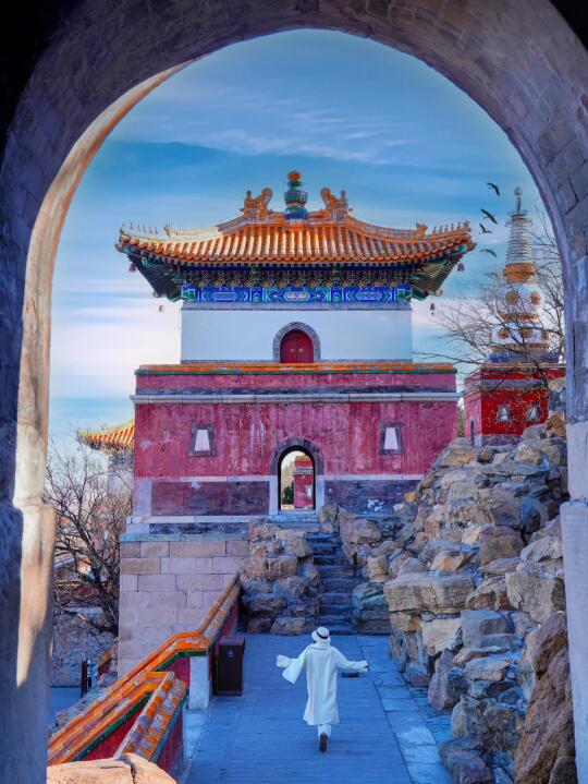 可以用石栏的镂空做前景,拍万寿山与佛香阁同框;或者站在假山上拍人与佛香阁同框~