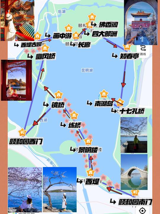 南门进➠西堤➠景明楼➠练桥➠镜桥➠豳风桥➠西堤古柳➠画中游➠佛香阁➠四大部洲➠乐寿堂➠知春亭➠十七孔桥➠南湖岛