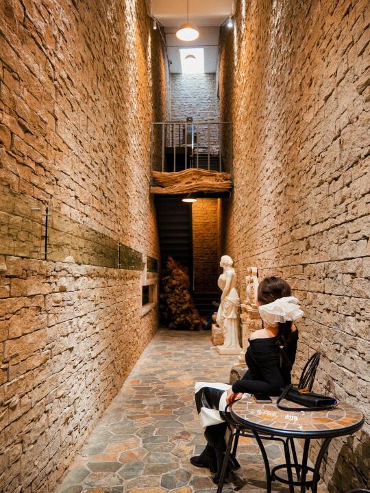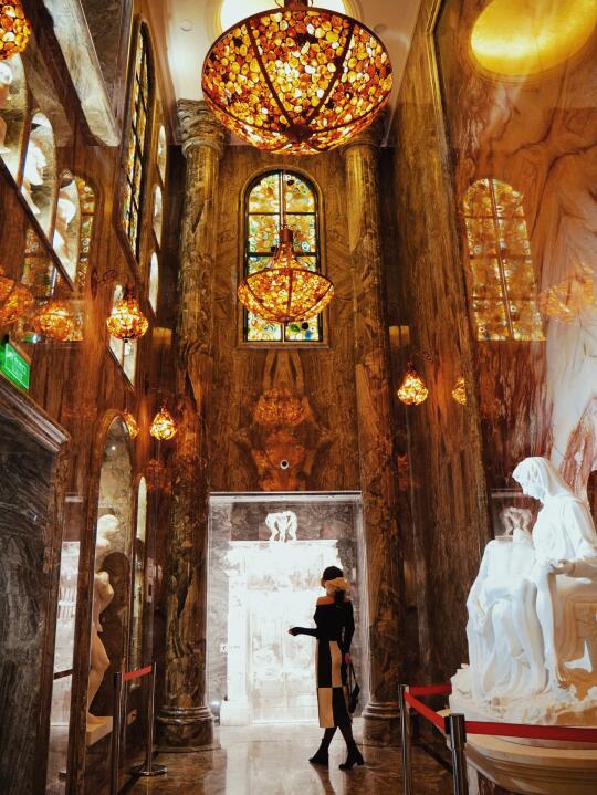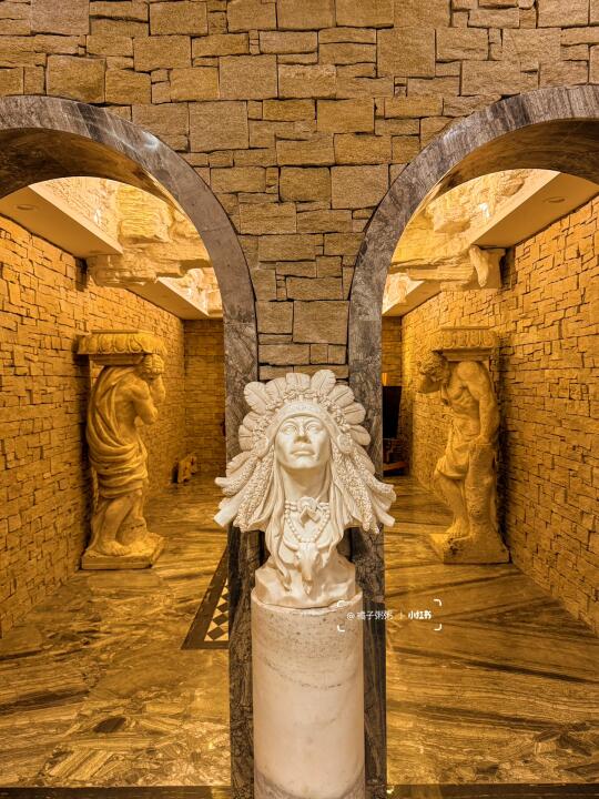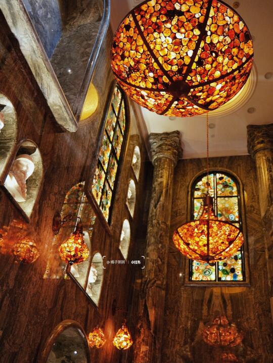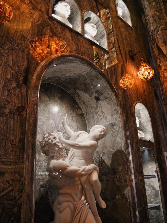 坐电梯到地下二层,就会看到这座密室艺术馆,仿佛穿越到中世纪欧洲古堡,1500㎡空间里,800+艺术品、天然岩石画、19世纪的欧洲古董家具,在暗黄的光影下,更显复古、神秘、异域!!