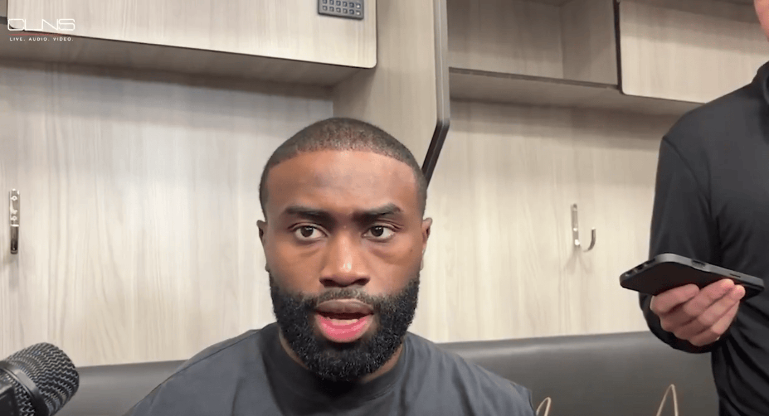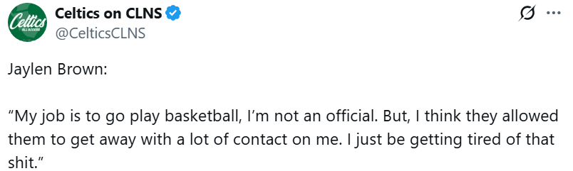 赛后,杰伦-布朗接受了记者的采访,谈到了本场比赛的判罚尺度: