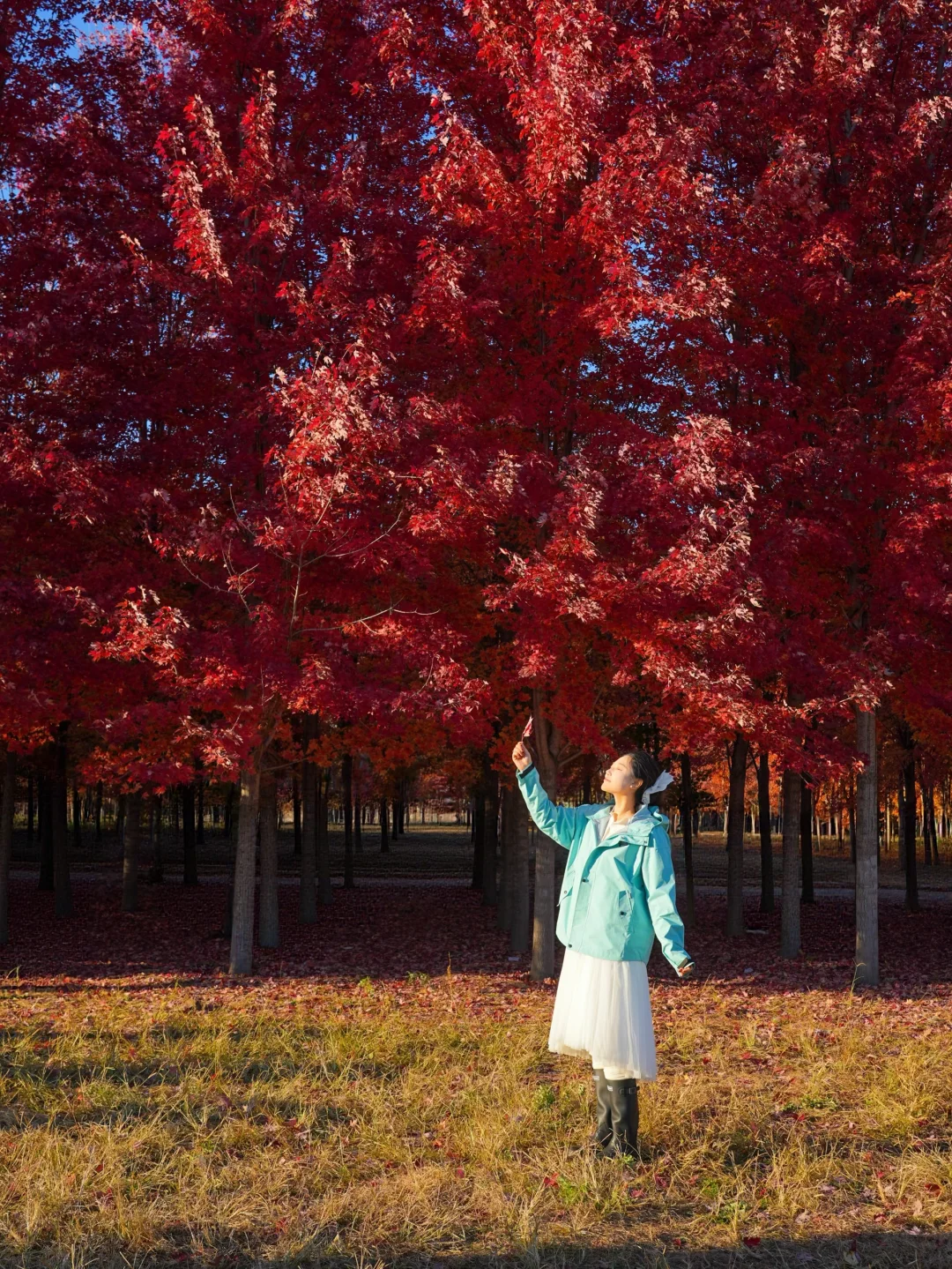 ▫️人物站在红枫林里,摄影师站在远处10m,拍出枫叶隧道既视感!