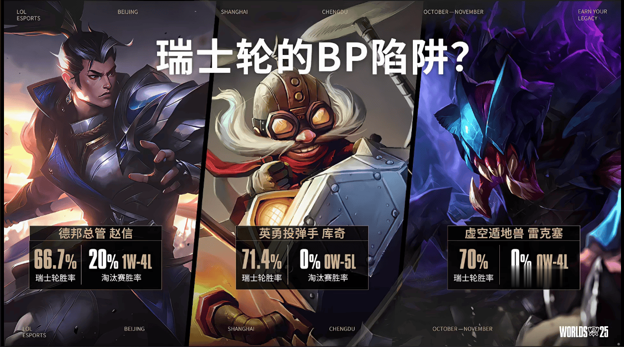 虎扑11月02日讯1.瑞士轮的BP陷阱?图一为瑞士轮阶段胜率极高而淘汰赛胜率极低的三个英雄,分别为淘汰赛阶段1胜4负的赵信,0胜5负的飞机,0胜4负的雷克塞。