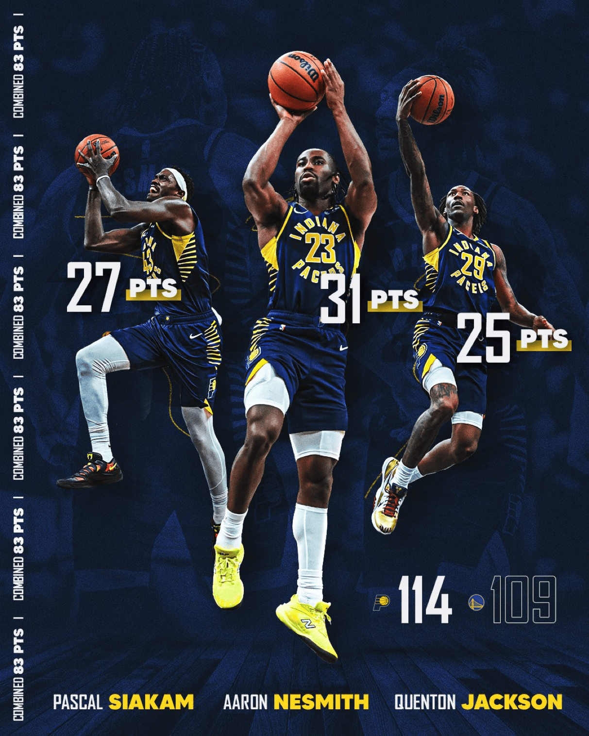 “三重威胁!阿伦-内史密斯、帕斯卡尔-西亚卡姆和昆顿-杰克逊在战胜勇士的比赛中合砍83分。”