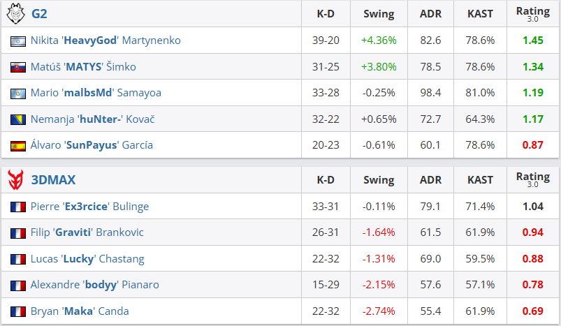 图二G2选择Train,HeavyGod火力全开,单图轰下1.66rating和24-8K/D,G2进攻方半场拿下7分,随后下半场立足防守、稳扎稳打,以13-8再下一城,直落两图复仇法国人,赢取小组赛开门红。