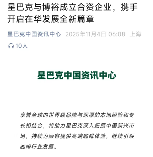星巴克执行副总裁兼中国首席执行官刘文娟表示:“在星巴克中国当前健康的发展势头下,与博裕的强强联合将进一步助力我们充分释放巨大的市场潜力,为更多中国顾客带来卓越的高端咖啡体验,为我们的绿围裙伙伴们创造更广阔的职业发展机遇,并推动中国精品咖啡行业的进一步升级与发展。此次合作彰显了星巴克在中国市场新阶段发展的坚定承诺。”
