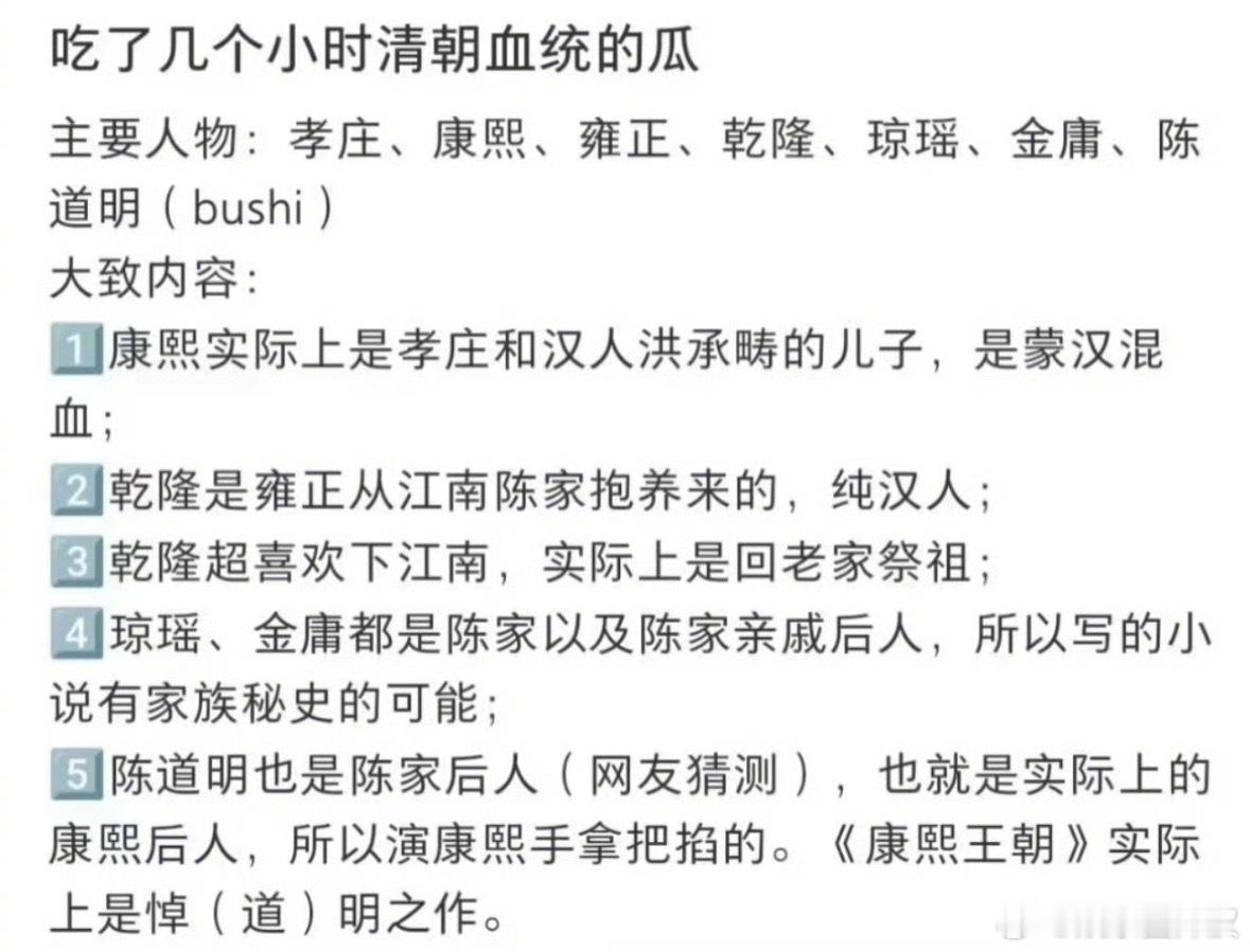 就是大玉儿把自己和皇太极的孙子换成了和洪承畴的儿子登基为康熙,也就是把顺治的儿子换了,康熙的四子福晋临盆恰逢与海宁陈家同日生产,自家是女儿就狸猫换太子为陈弘历,乾隆即位遂让五阿哥与陈知画结亲。而我们陈道明老师地点正确,长相正确,姓名正确[doge]以此网友产生了联想。