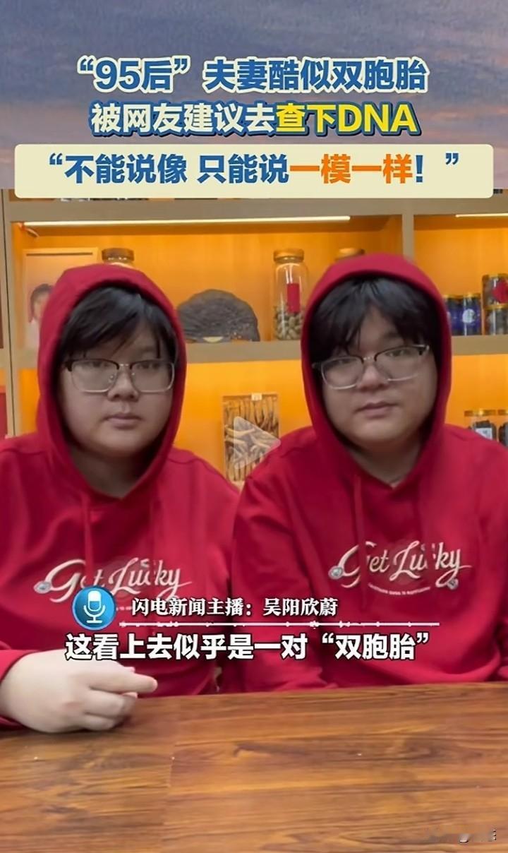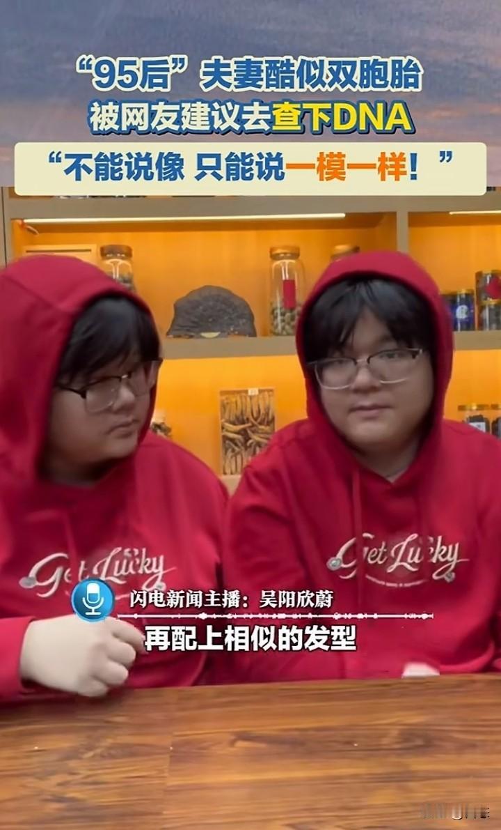 不敢相信,95后一对夫妻,如果不说的话,大家都以为是双胞胎。太像了,妻子的装扮和丈夫一样,那可以说完全就 是一个模子刻出来的。很多评论一对夫妻都会说,你们很有夫妻相,可能他们就是有夫妻相吧! 能遇到和自己相似的对象,这也是一种缘分。希望他们能白头偕老,不离不弃的。 你们有没有见过很像的夫妻呢?