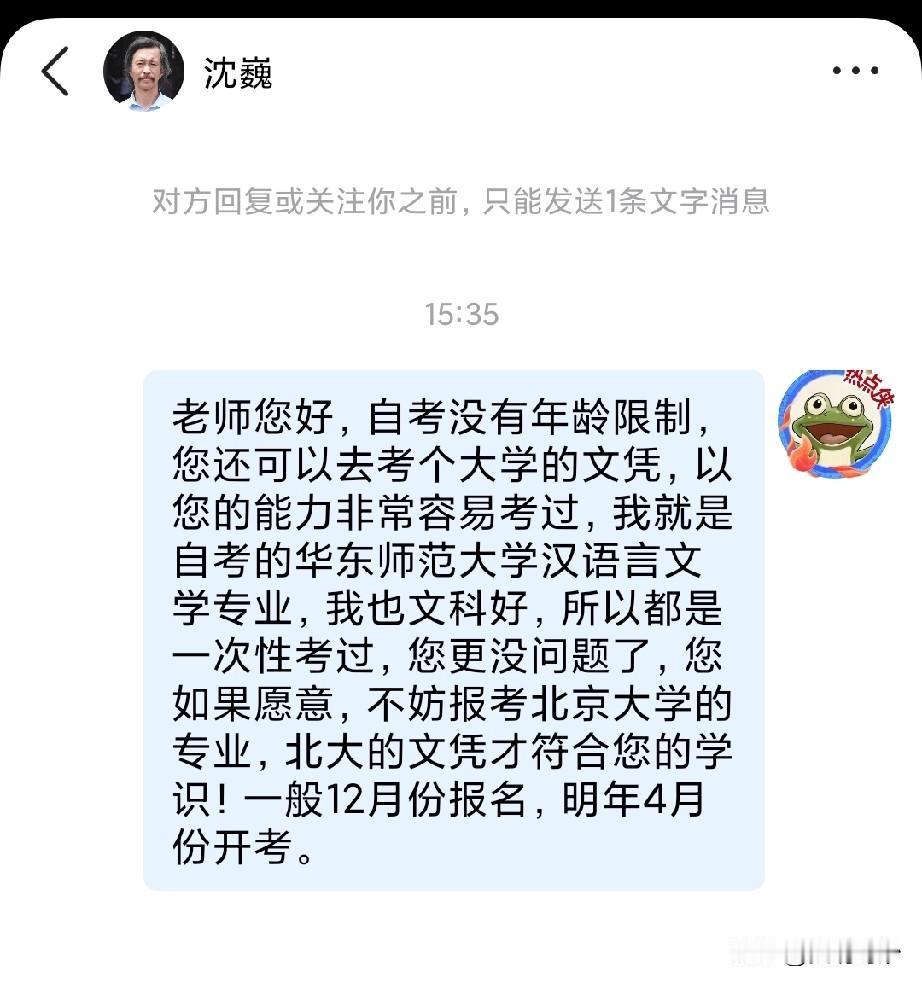 上海流浪大师沈巍有意复读考大学,不知是玩笑话,还是真有此意? 近日,沈巍接连两天都碰到研究生粉丝,这不禁让他十分难过,因为他自己是高中文凭,他幽默地说,他真想买块豆腐撞一下,怎么办呢?“我想复读,可这么多人天天围着我,我怎么复读呢?” 其实以沈老师的学识,通过自考拿大学文凭是十分简单的事,本人也是通过自考拿的大学文凭,我也是文科很好,中专毕业20年后才想到自考拿个大学文凭,但一直听说自考很难,却不料,非常简单,对于会的人来说非常简单,我几乎没怎么看书,更别说参加什么培训,但考试的时候都是每门学科一次性过。 我通过沈巍圈中的一些主播转达了我的想法,也通过关注沈巍账号后给他发了私信,不知道他看到没有,也是很希望他能圆自己的大学梦! 上海沈巍 大学自考