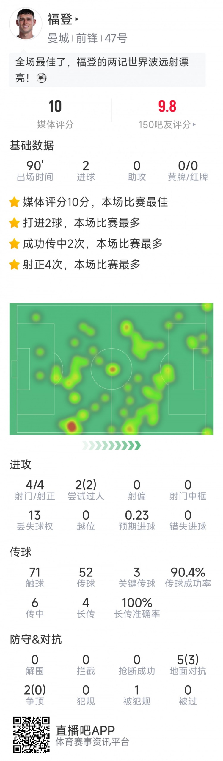 福登本场数据:梅开二度,4射4正,3次关键传球,评分10分