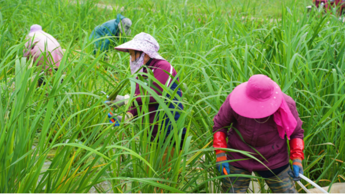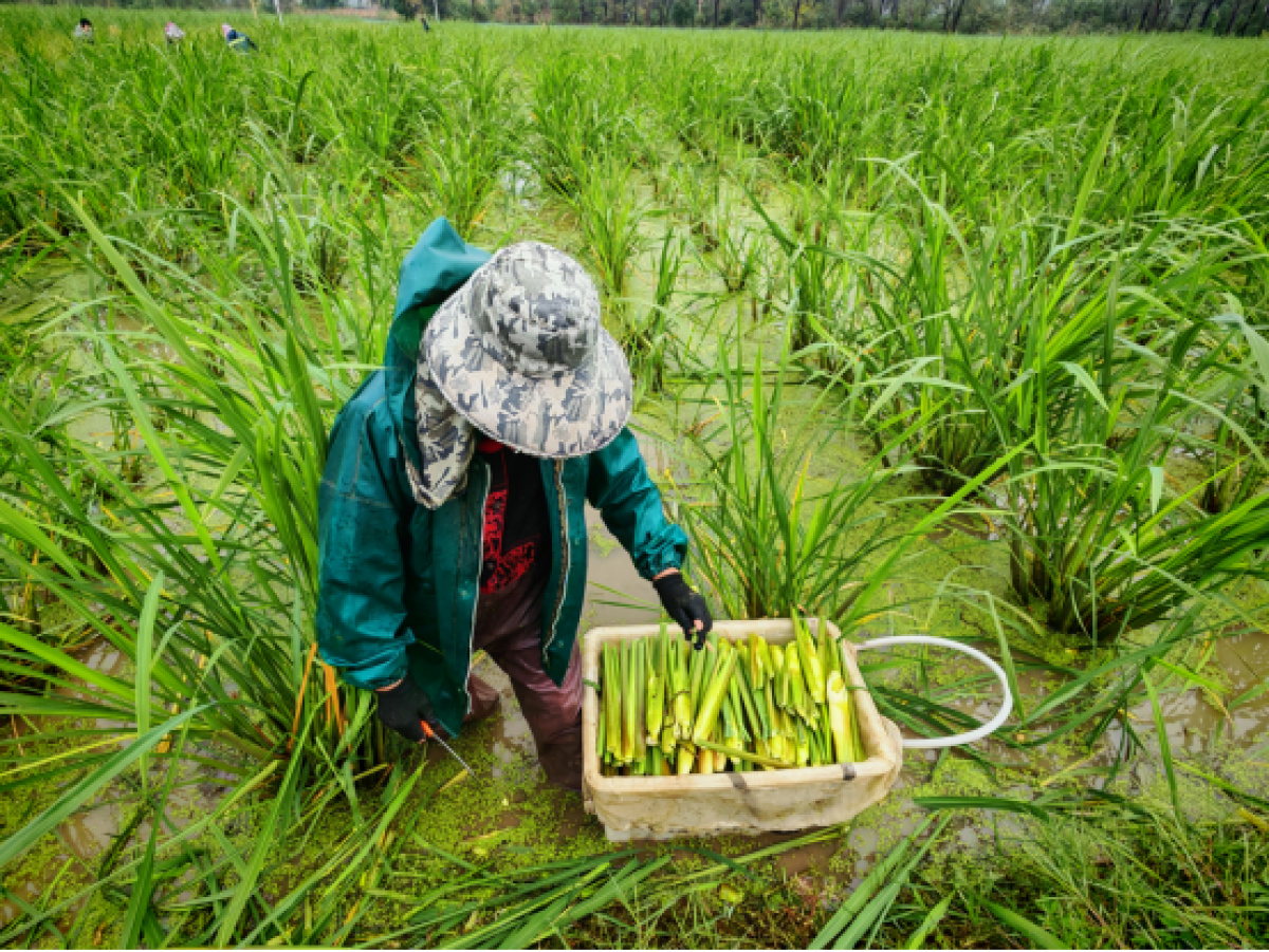 茭白也叫水黄瓜,形态呈纺锤形,是一种较为常见的水生类植物。茭白当年种植、当年丰收,周期短、见效快、经济效益高。依托2022年国家发改委确定的“苏州与信阳对口合作”政策契机,结合苏州市民对绿色农产品的需求,吴店村以集体合作社为主体,统筹本地资源,打造供苏茭白基地,成为苏信农产品直供体系的核心节点之一。