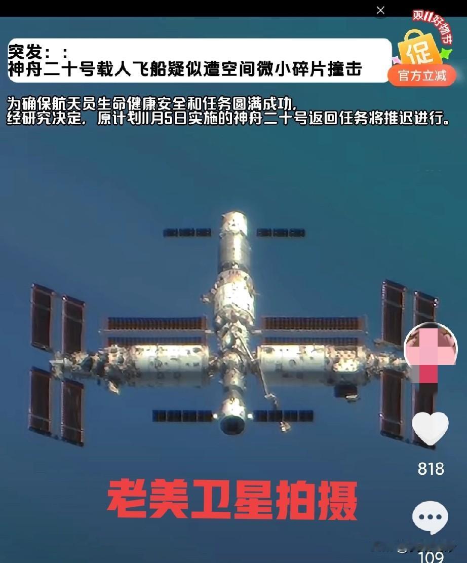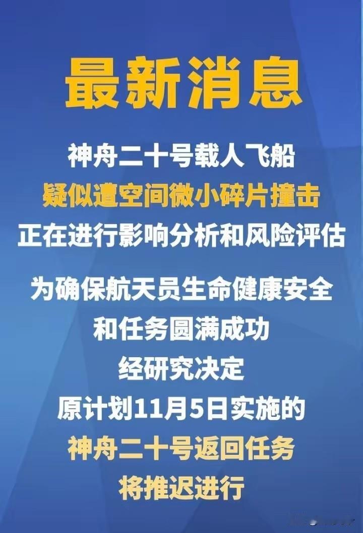 完全不怕,小事一桩,昨日突发,中国航天器疑似受碎片撞击,这种风险中国早就考虑到,并且相关预案早就准备多年。 11月5日,神舟20号载人飞船疑似遭遇空间微小碎片撞击,返回任务推迟。这是中国空间站建成后首次公开此类事件,却检验出中国载人航天“安全第一、备份充分、预案周密”的成熟体系。 我国早已建立“打一备一、滚动备份”机制,神舟22号飞船随时可应急发射救援。同时,天宫空间站“三舱三船”构型与6人驻留能力,形成“在轨冗余+地面热备”双重保险。 此次事件也为我国航天收集了珍贵数据,助力下一代飞船设计,更彰显出中国航天将风险转化为技术积累的成熟思维,这是大国航天的自信与底气。 据悉,老美的卫星一直跟踪拍摄我航天器相关动态,相关信息也是他们首先披露的,估计暗中偷着乐呢,我们大方公开,再次展现了我们的信心与底气! 中国神舟二十号 地球撞击风险