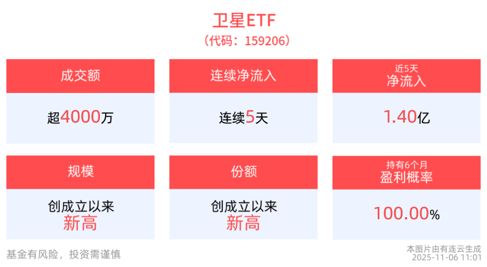 从资金净流入方面来看,卫星ETF近5天获得连续资金净流入,最高单日获得7209.17万元净流入,合计“吸金”近1.40亿元。