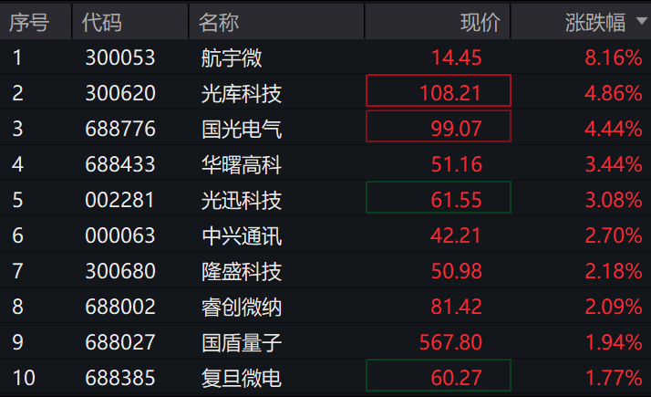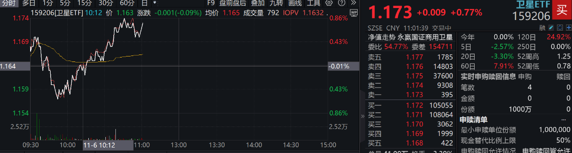 截至11:01,卫星ETF(159206)上涨0.77%。成分股航宇微涨超8%,华曙高科、光库科技、光迅科技、国光电气等个股跟涨。