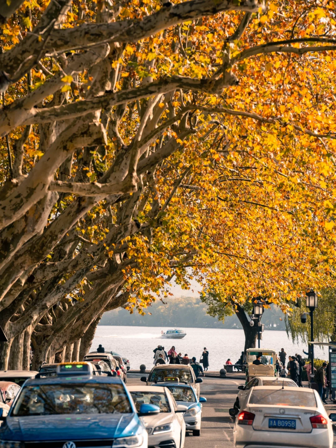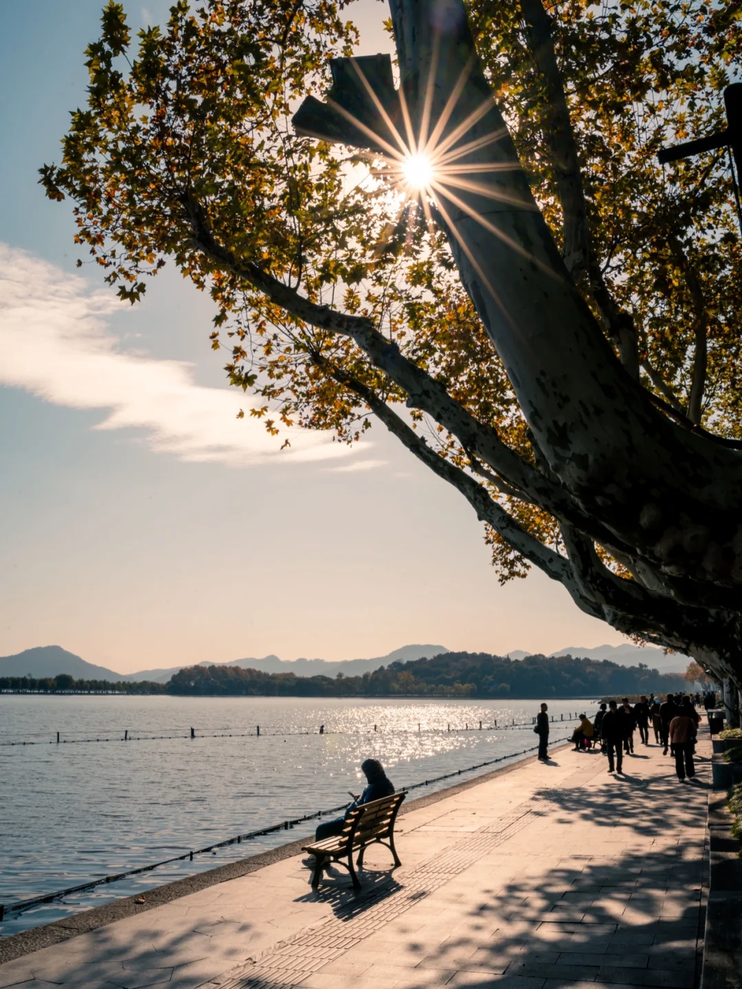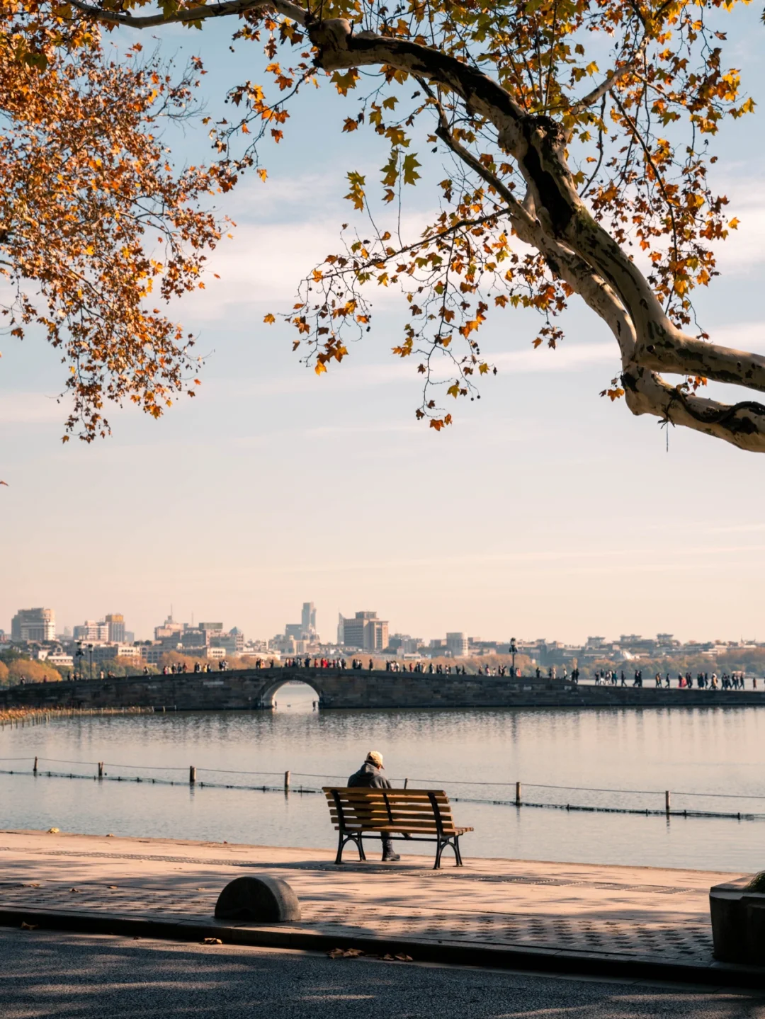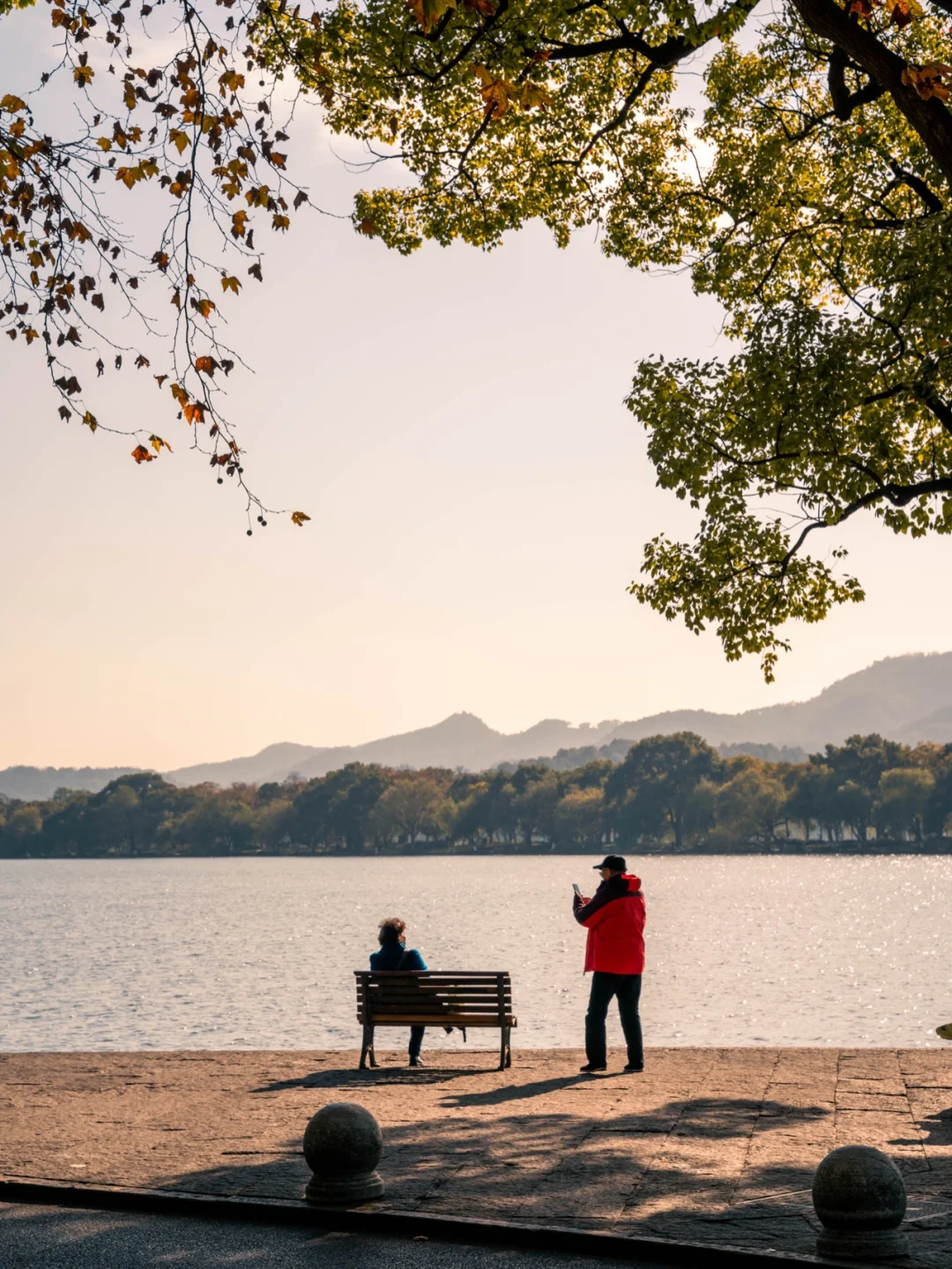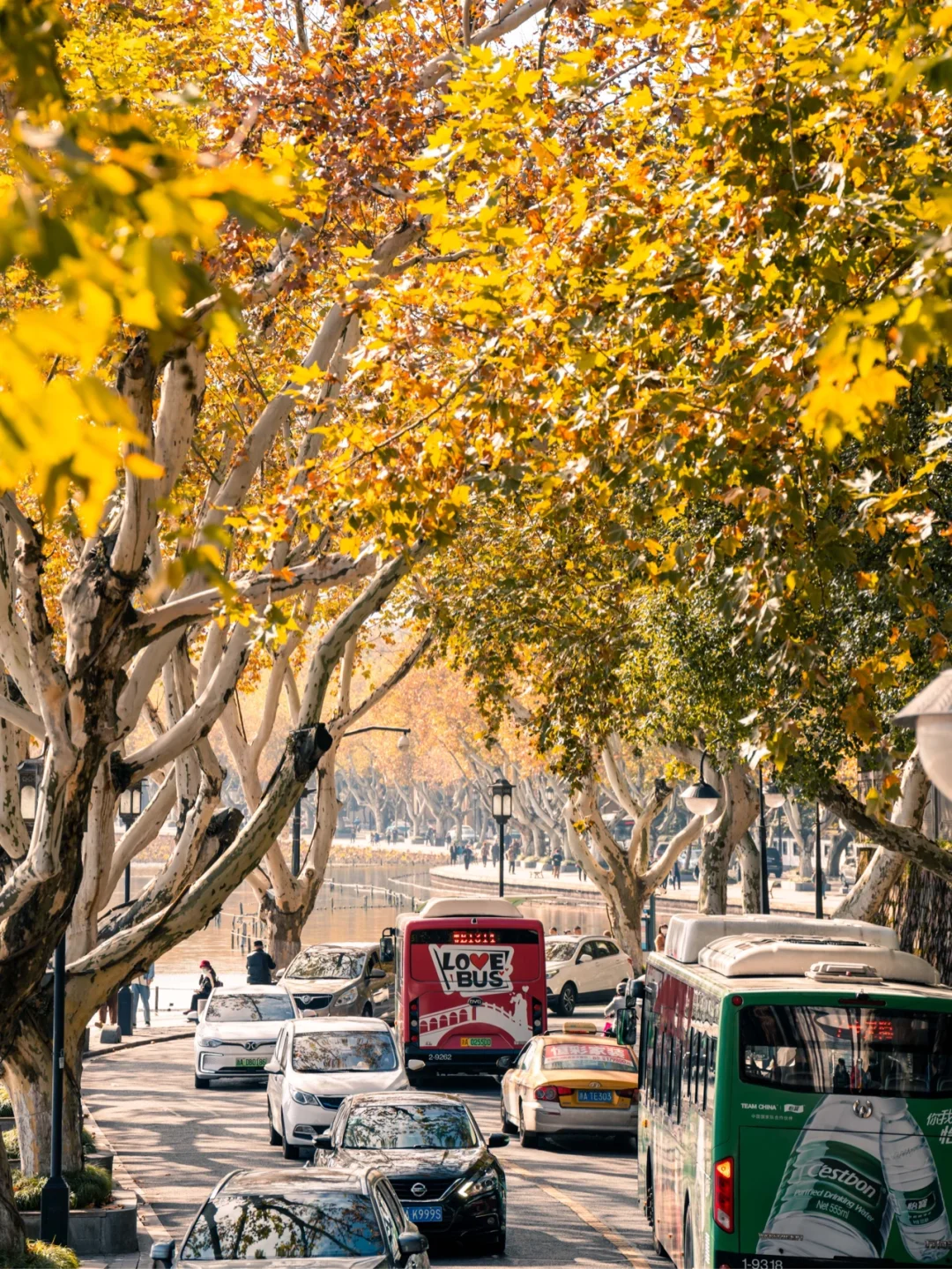 秋日的午后漫步北山街,身边驶过的是杭州最美公交-1314路中意巴士,沿湖的长椅上随处可见相互依偎的情侣,让北山街更加有爱
