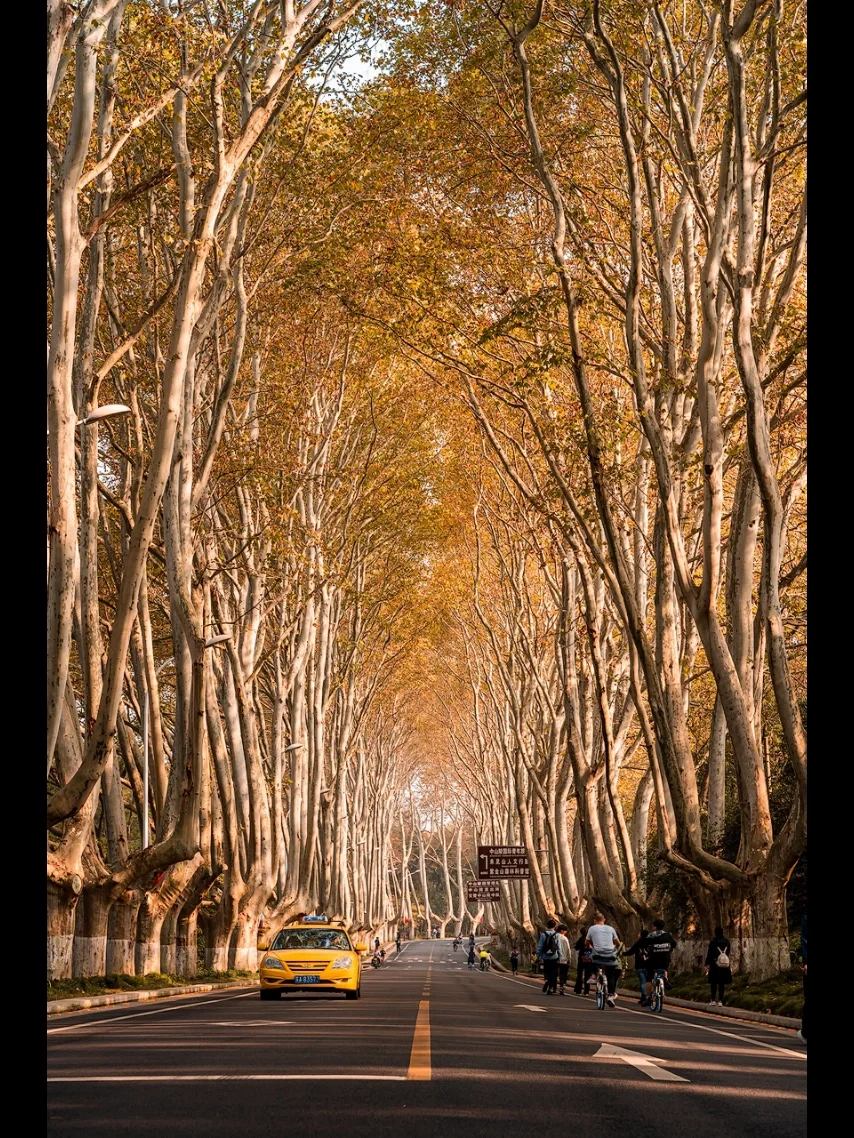 两旁都是高大的梧桐树,日落时分光影很美,推荐使用长焦