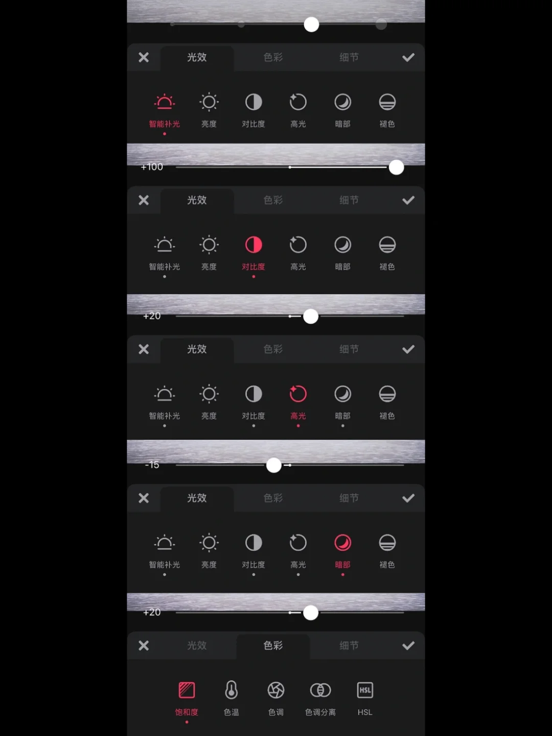 3⃣️使用滤镜之后,一定要再进行二次调整,原片发暗发灰于是智能补光/拉高对比度、提高高光以及压低暗部,让图片看起来更通透;同时没有阳光,图片会暗淡很多,适当增加饱和度还原色彩,调整步骤都在图4中,得到最终的成片如图5
