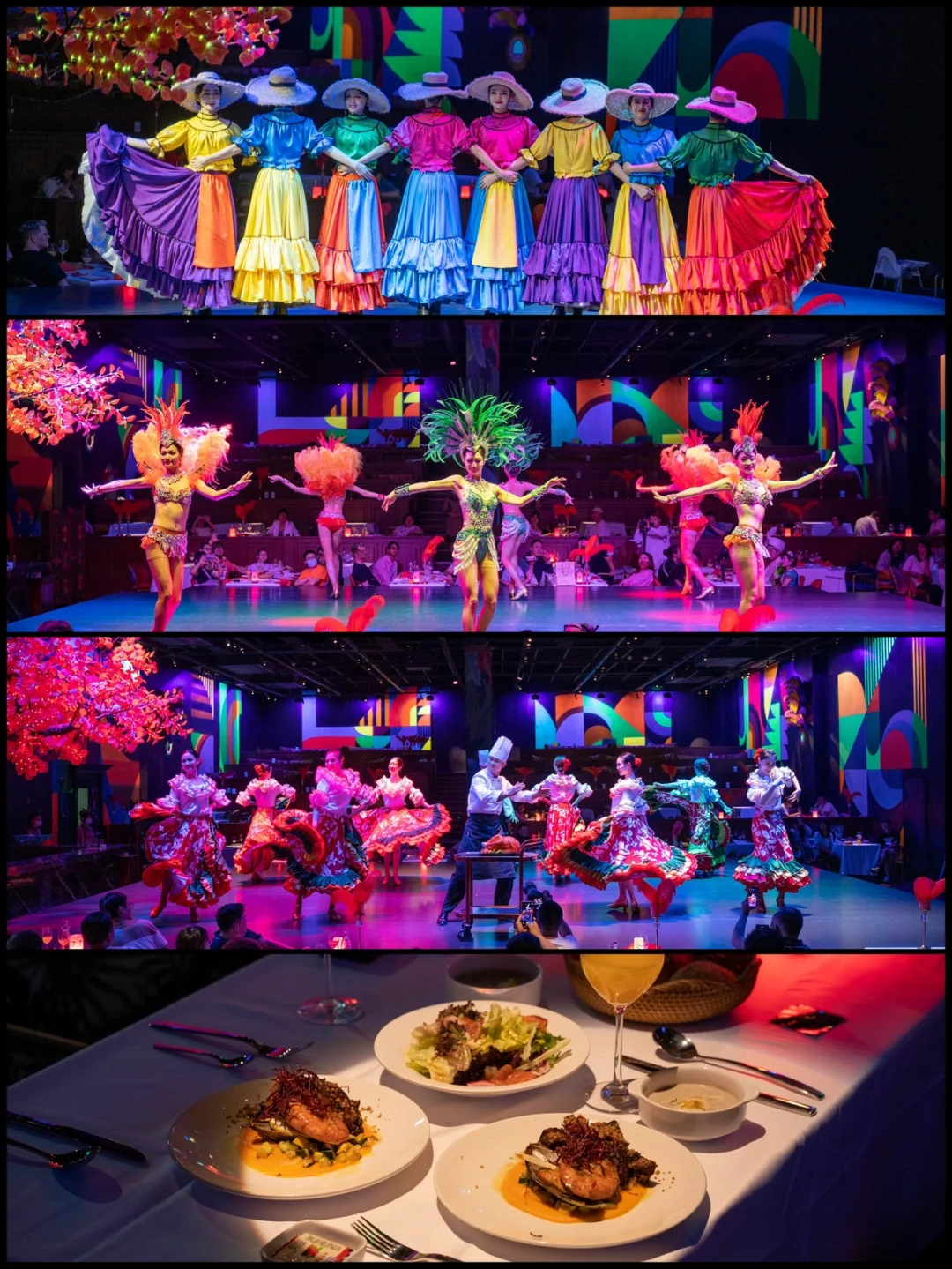 1⃣️“上海千古情”讲述上海的前世今生,从春秋战国一直到新中国成立,是不容错过的主秀;有小朋友的推荐“WA!恐龙”;我们是从中午玩到晚上,选择的是带餐秀“热情桑巴”(图2),在南美风情中享受西餐的美味,看完节目晚上恰好去露台看看黄浦江风景(图1和3)