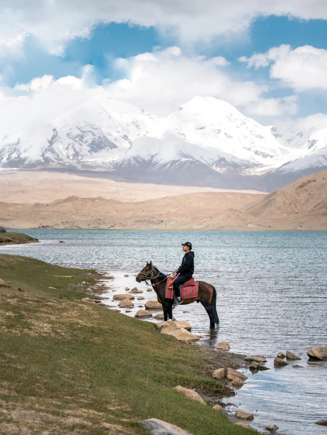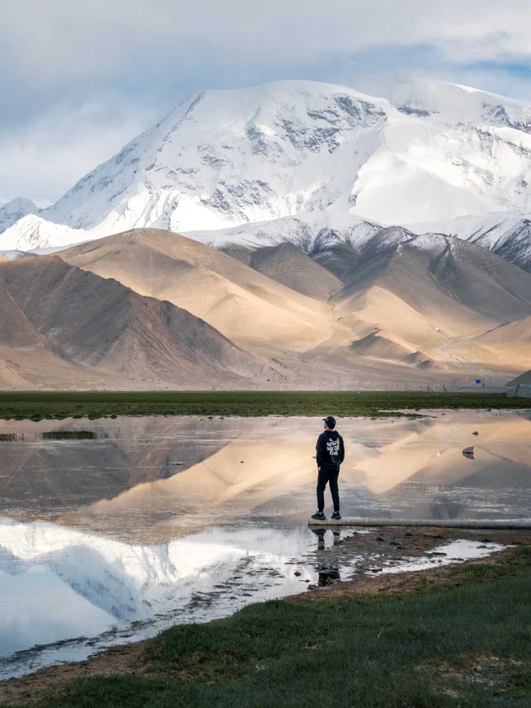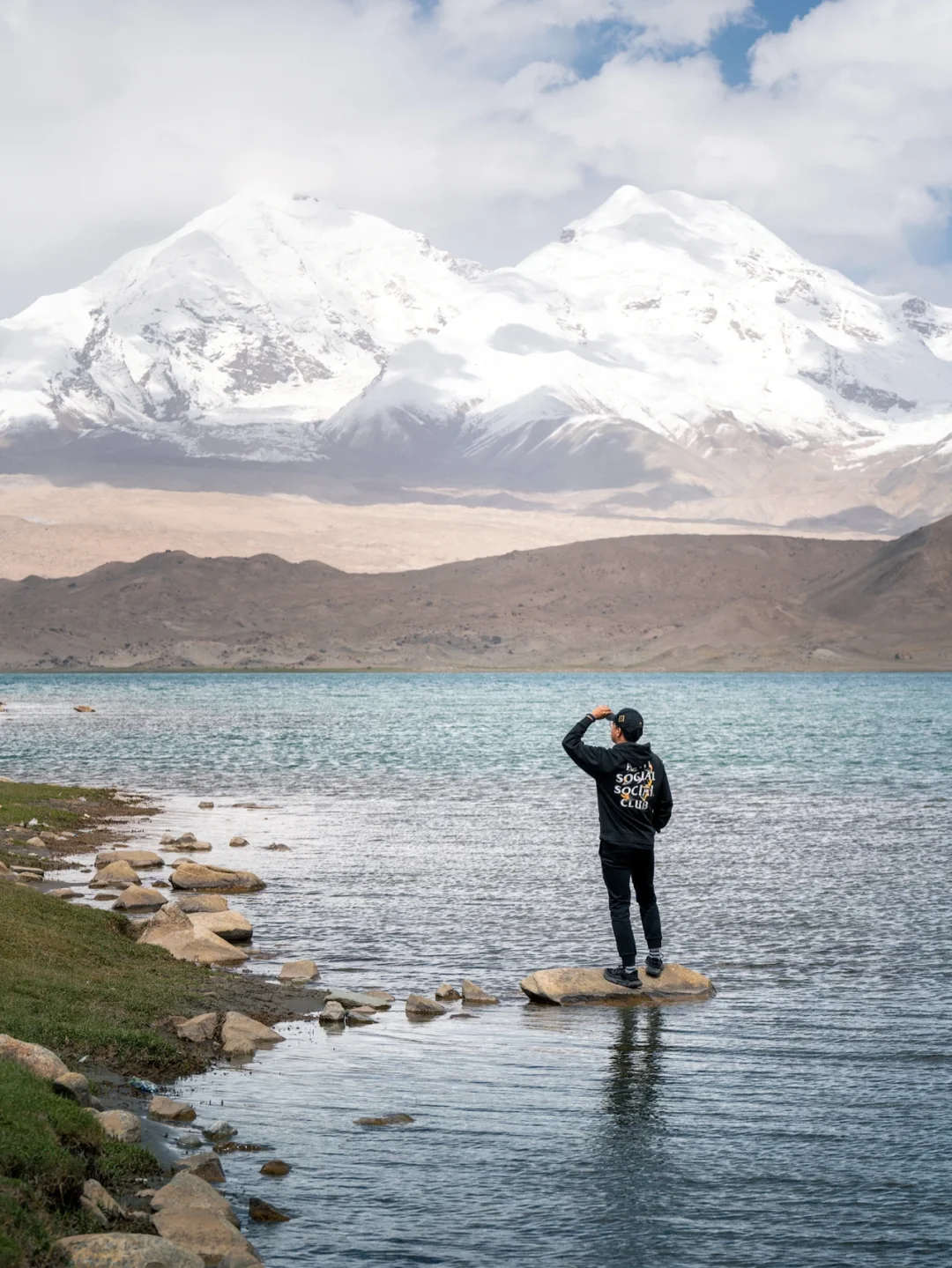 机位2⃣️然后我们继续往前开,找到喀湖的边缘处,那儿处于避风处,终于看到了慕士塔格峰的倒影如图1/4-5,真的很壮观