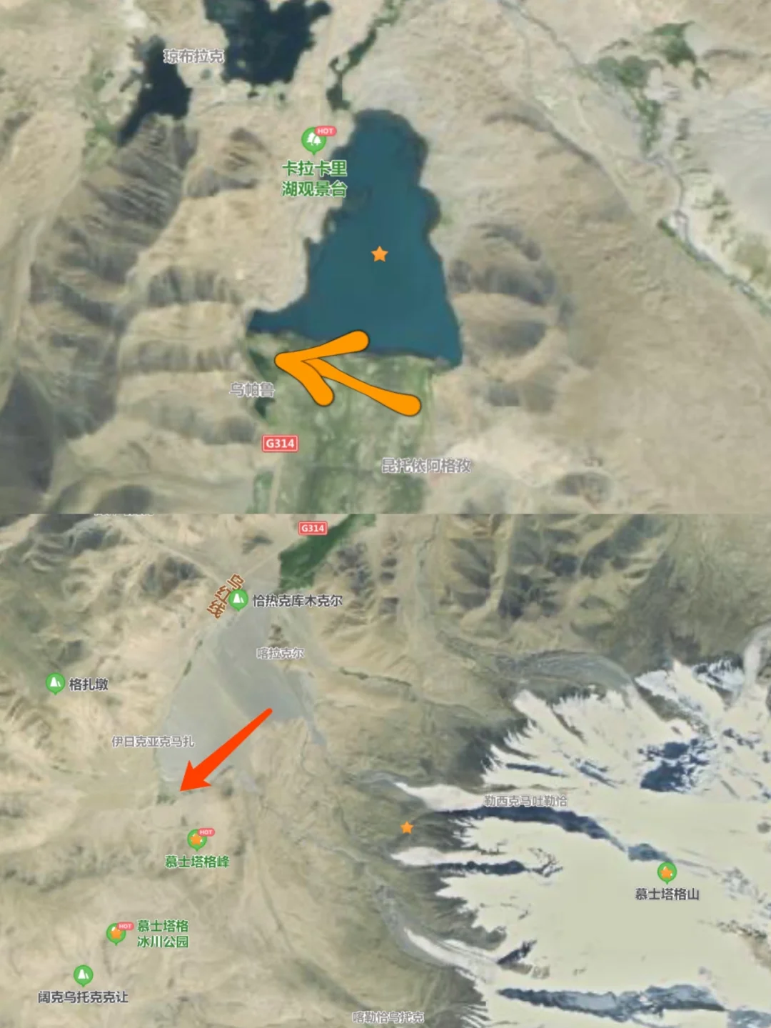 很多人以为只有川西和西藏才有雪山,于是忽略了新疆的美景,当汽车在314国道开到喀拉库勒湖时就能看到壮丽的慕士塔格峰,在无风的情况下,湖面的倒影非常好看,在喀湖拍完雪山的倒影之后继续前行,会发现离雪山越来越近,当在地图上看到自己离雪山的直线距离最短之后一定要下来感受雪山的壮阔。