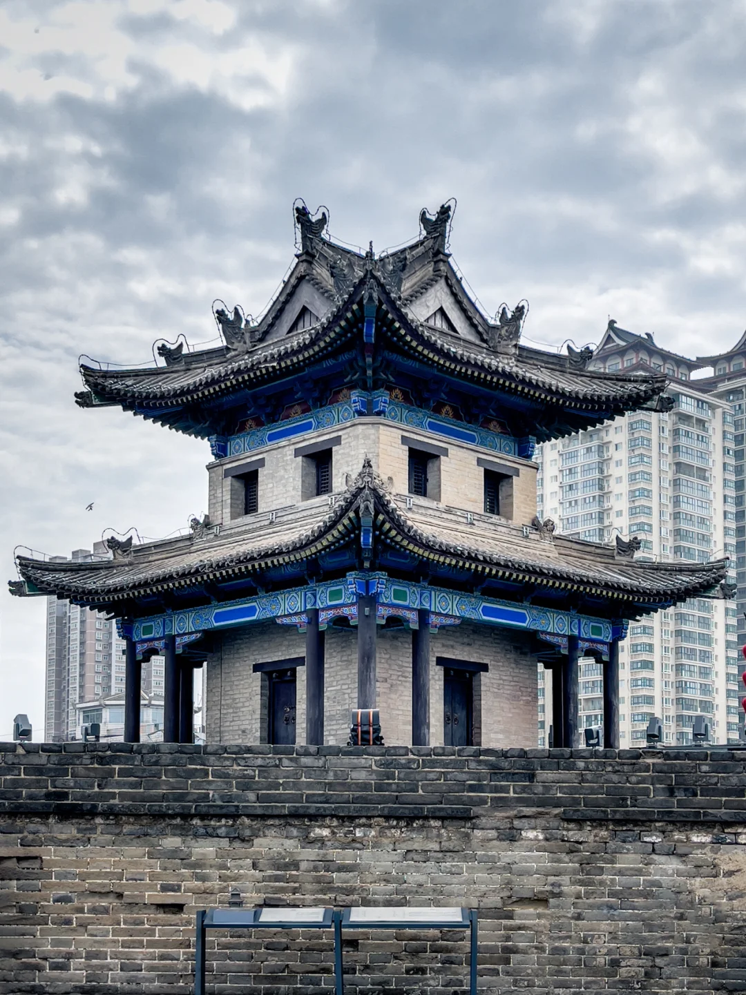 4⃣️角楼,如图6;西安的角楼很有特点,是蓝色的主色调,拍摄于西安城墙东南角的角楼
