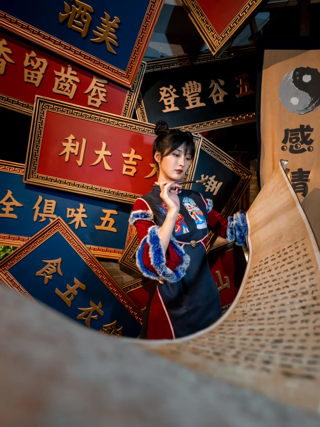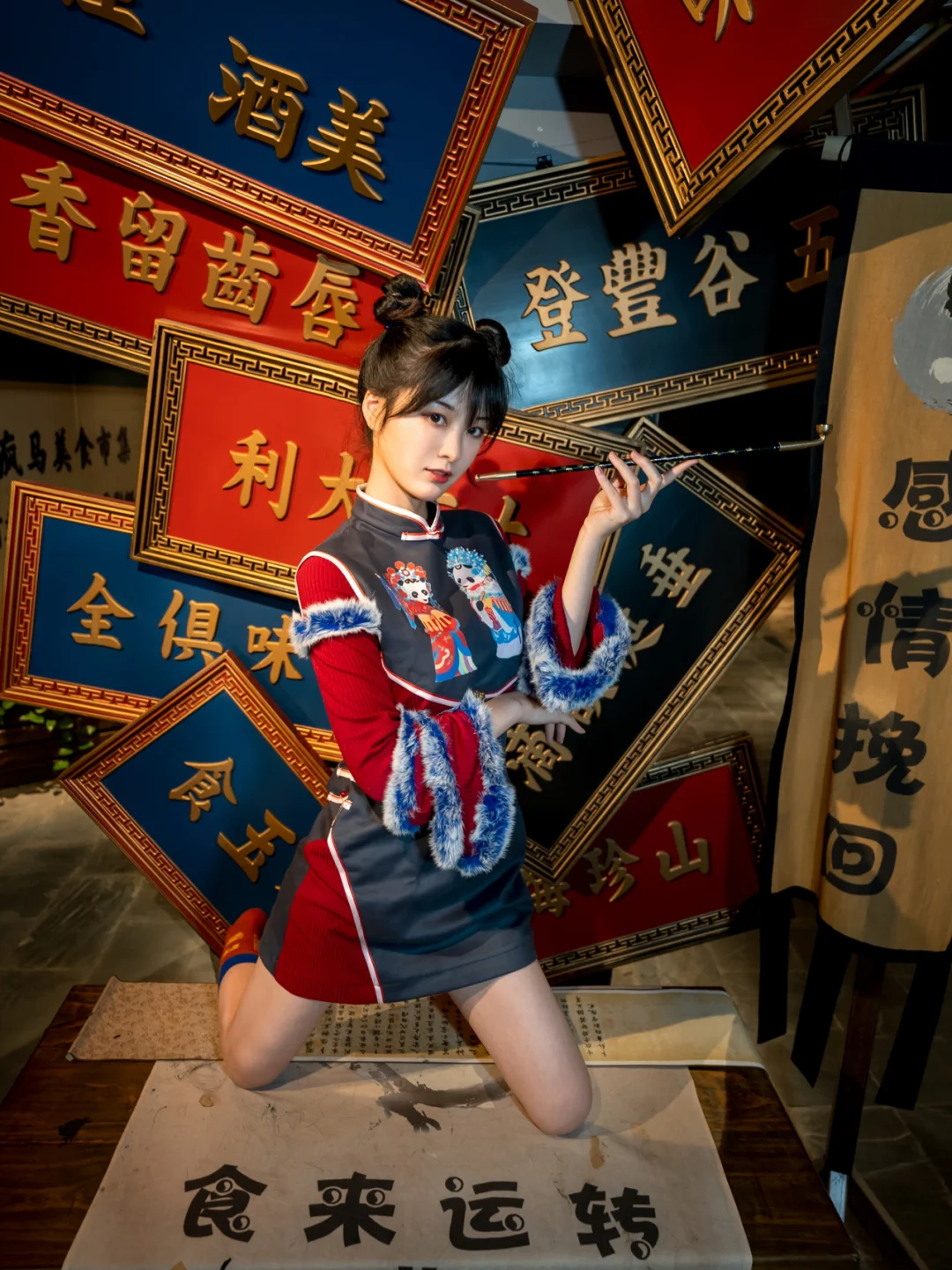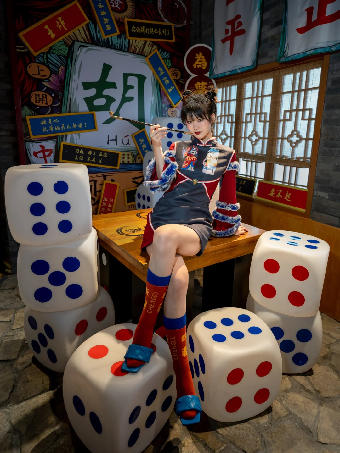 拍摄道具🔧:提前看好了场景图,模特搭配了专门的国潮改良旗袍,准备了烟斗、扇子等道具