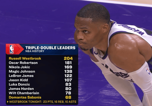 比赛现场转播方打出字幕,给出了目前NBA球员三双排行榜,其中威斯布鲁克204次排在第一,奥斯卡-罗伯特森181次排第二,尼古拉-约基奇169次第三。