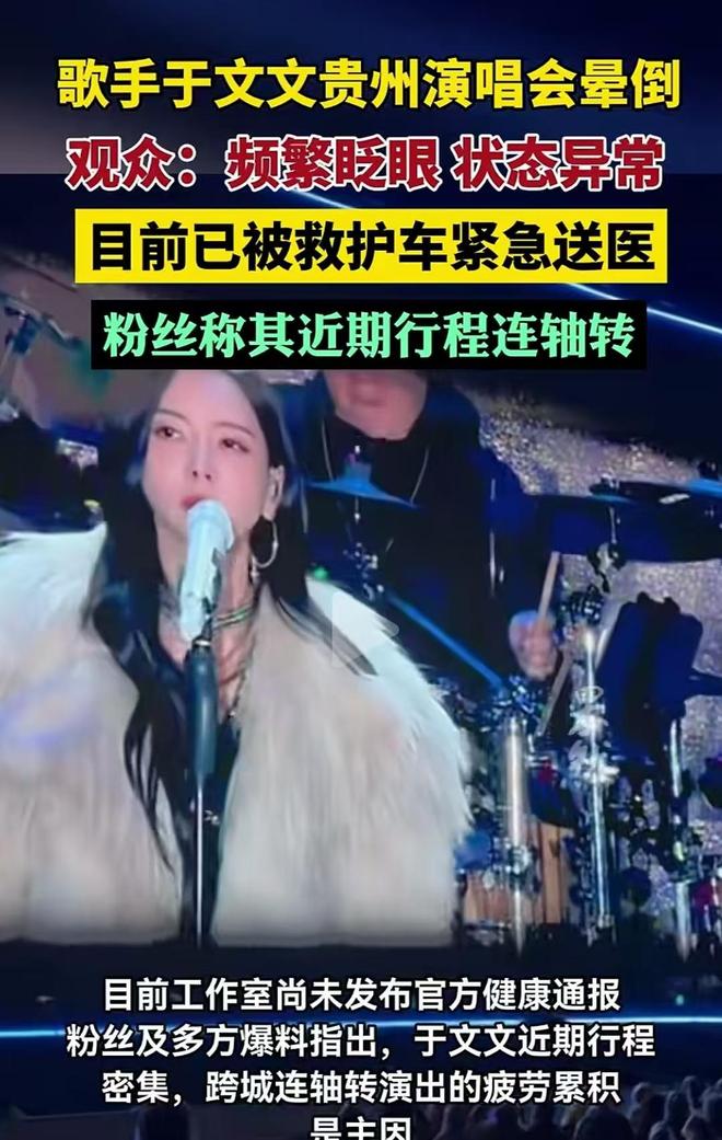 当晚的安顺最低气温只有 2℃,台下观众裹着羽绒服还冻得直打哆嗦,可于文文为了舞台效果,只穿了件薄薄的毛绒外套和皮裤。早在唱第二首歌时,就有细心的观众发现她频繁眨眼,手也控制不住地发抖,可她还是硬撑着唱完了四首歌。直到最后一个音符落下,她弯腰撑着膝盖大口喘气,下一秒就侧身瘫倒,彻底失去了意识。