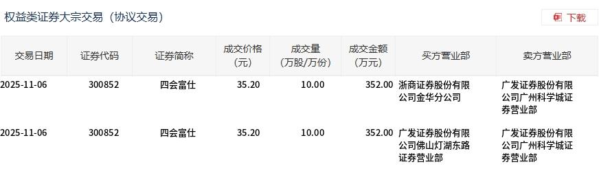 11月6日,四会富仕大宗交易成交20万股,成交额704万元,占当日总成交额的2.85%,成交价35.2元,较市场收盘价39.66元折价11.25%。