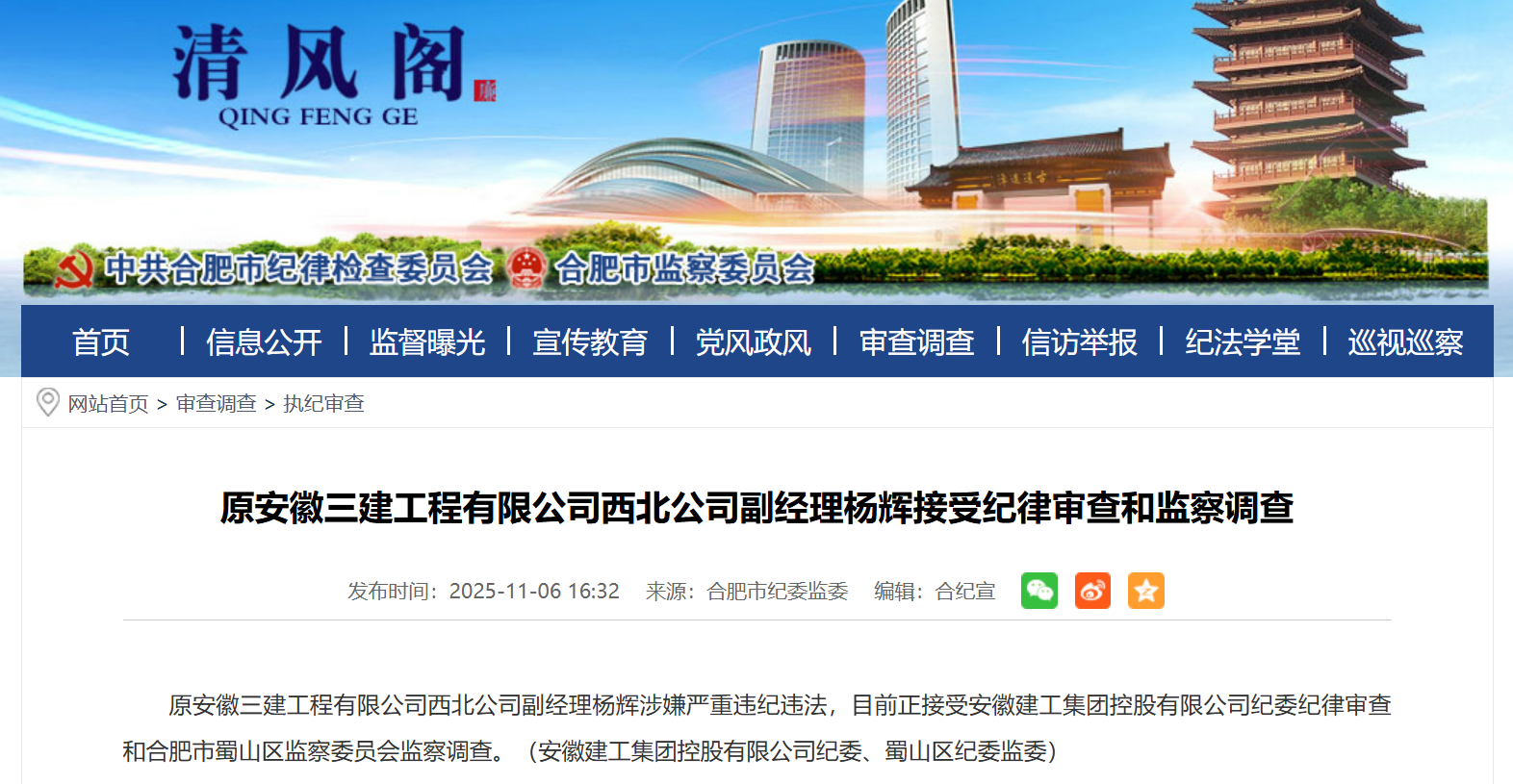 原安徽三建工程有限公司西北公司副经理杨辉涉嫌严重违纪违法,目前正接受安徽建工集团控股有限公司纪委纪律审查和合肥市蜀山区监察委员会监察调查。(安徽建工集团控股有限公司纪委、蜀山区纪委监委)