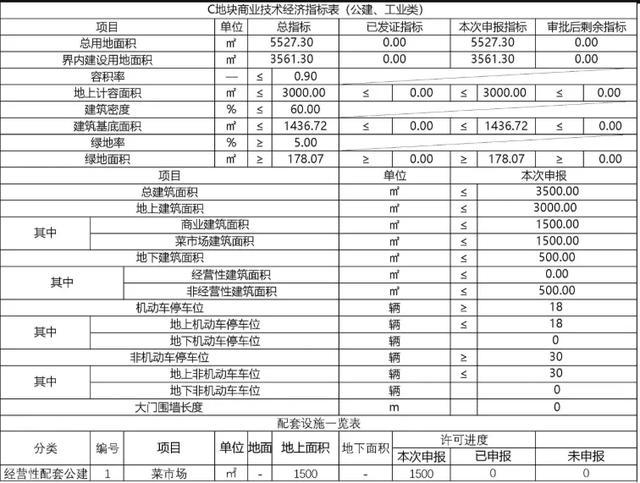 其中技术经济指标表显示,商业建筑面积≤1500㎡,菜市场建筑面积≤1500㎡,并配有机动车和非机动车停车位。