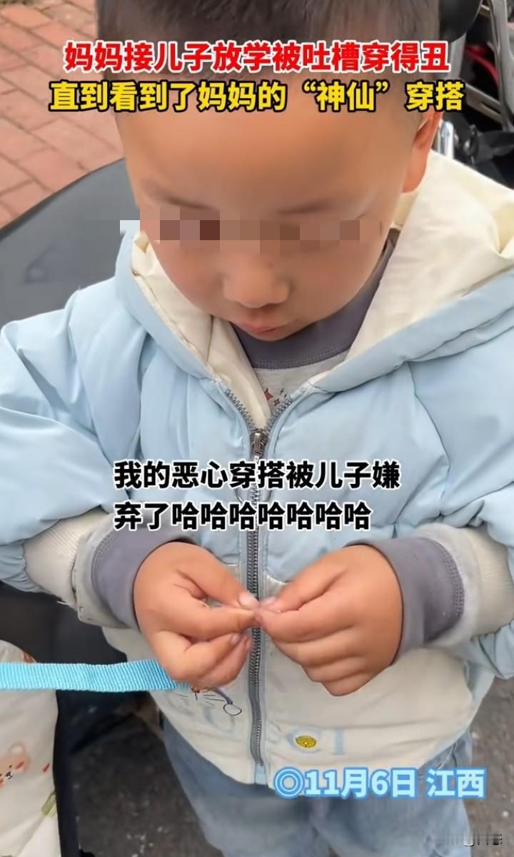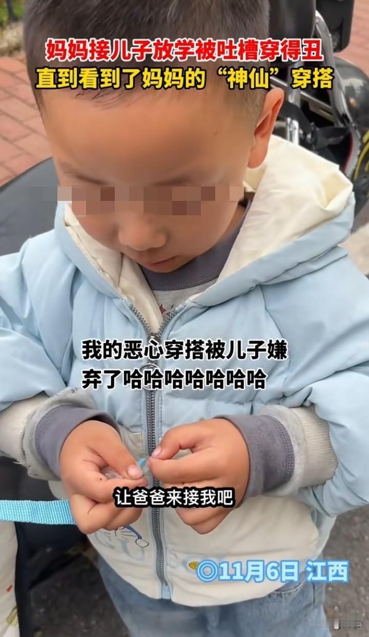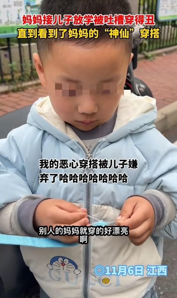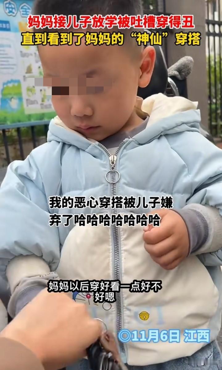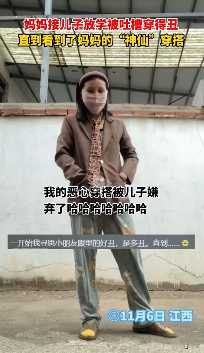 江西一宝妈接孩子放学,没想到妈妈的穿着被孩子破防了,孩子说,妈妈你得衣服好丑啊!以后还是让爸爸来接我 吧,别人的妈妈都打扮得漂漂亮亮的。孩子的妈妈说&哦,以后穿漂亮一点好不好。 我相信到底什么样的穿着才能让一个孩子这样说,真到女子出现。我无话可说,孩子绝对是无心的。 孩子都看不过去,作为广大网友,看到后,确实是奇葩搭配。 孩子都希望爸妈穿着得体,至少不那么另类吧! 对此你们怎么看呢?家长的穿着对孩子有影响吗?